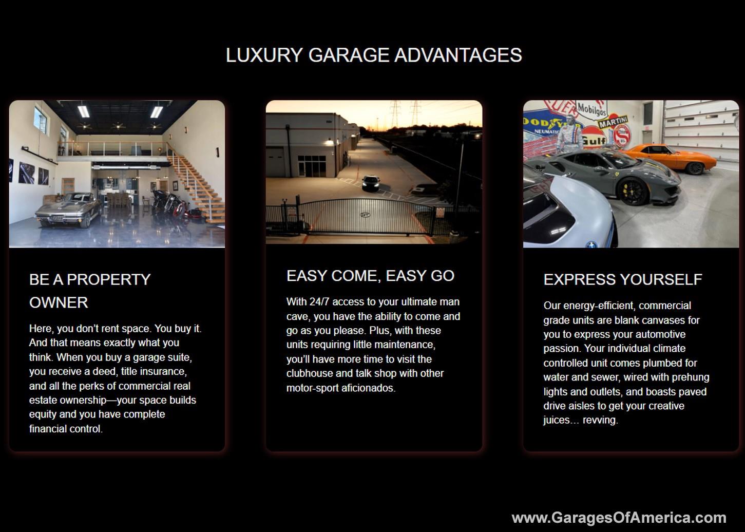 Fuel your motorsport passions and design your own showcar / boat / motorhome garage! Unit 104 is one of the largest luxury garage suites at Garages of Texas and one of the few that accomodates a full length motorhome or tour bus. Dimensions are approximately 50' depth x 40' width with a +/- 660sf mezzanine / loft. Commercial construction, state of the art security and ready for customization to any level you desire! Gated ent...