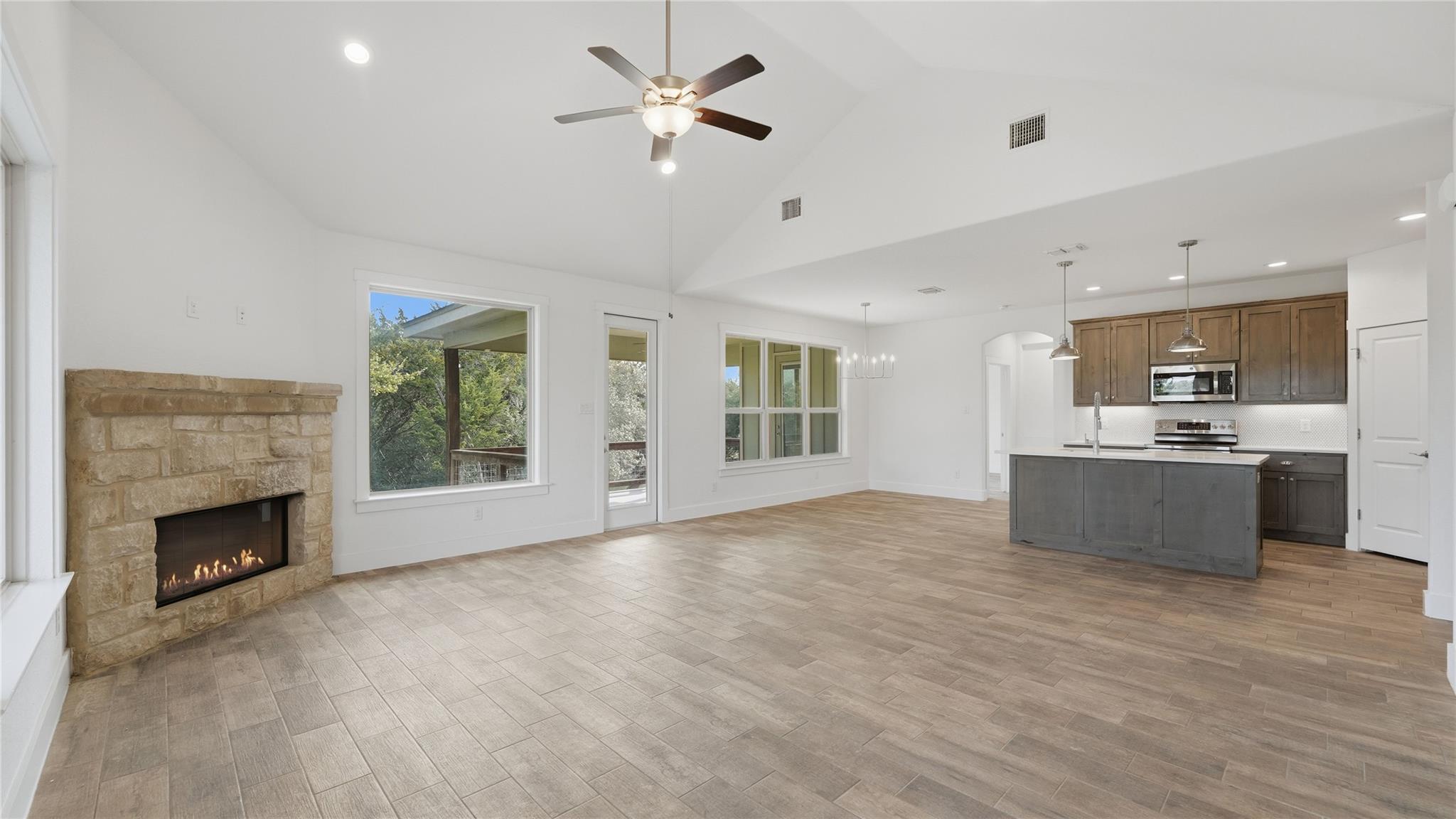 - Breakfast Bar, Ceiling Fan(s), Ceiling-High, Vaulted Ceiling(s), Corian Counters, Double Vanity, Eat-in Kitchen, High Speed Internet, No Interior Steps, Open Floorplan, Pantry, Primary Bedroom on Main, +2 more