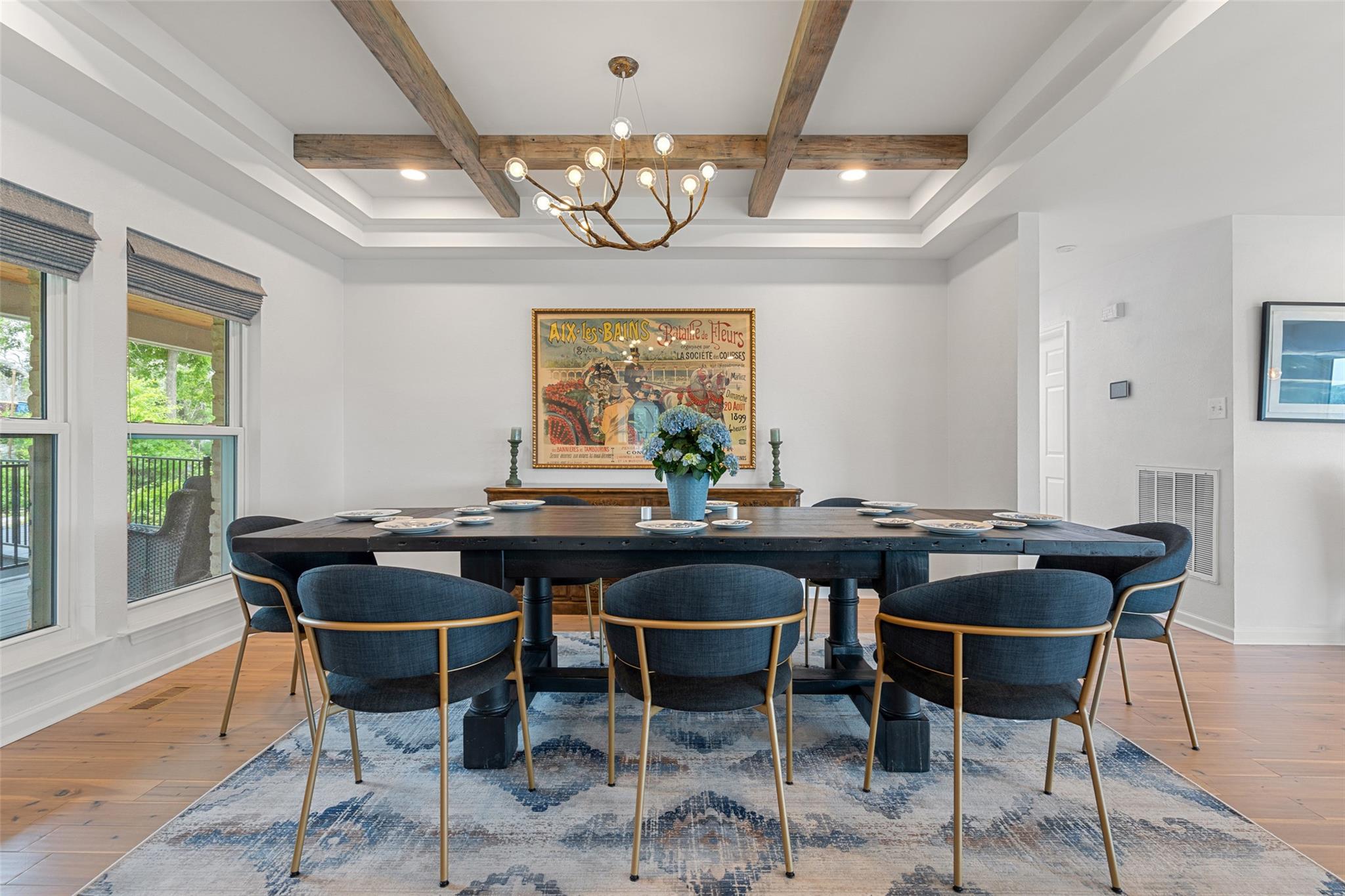 - Built-in Features, Ceiling Fan(s), Beamed Ceilings, Quartz Counters, Stone Counters, Double Vanity, Open Floorplan, Primary Bedroom on Main, Two Primary Closets