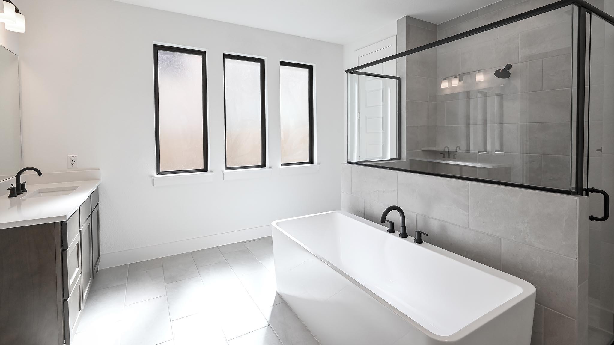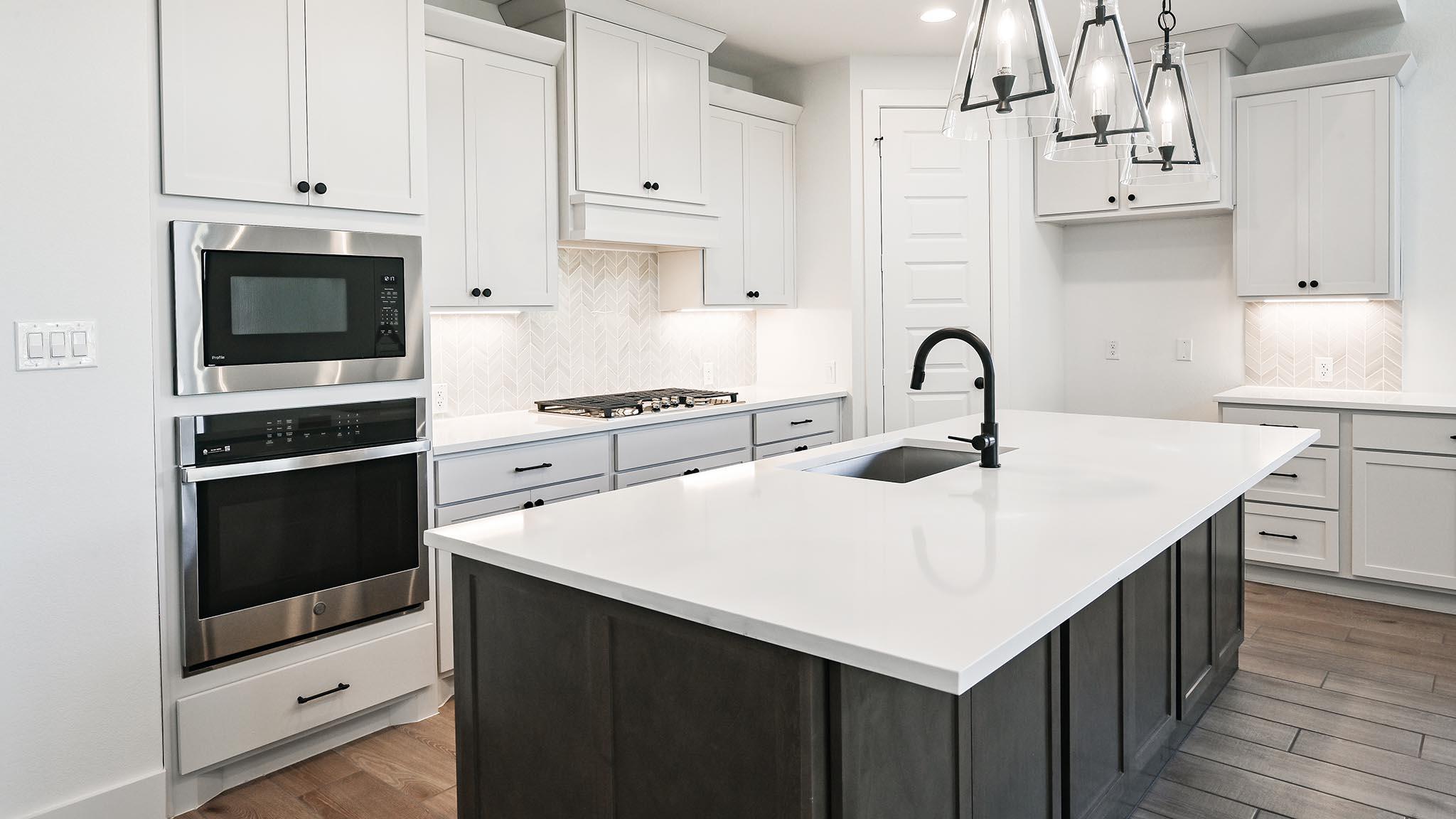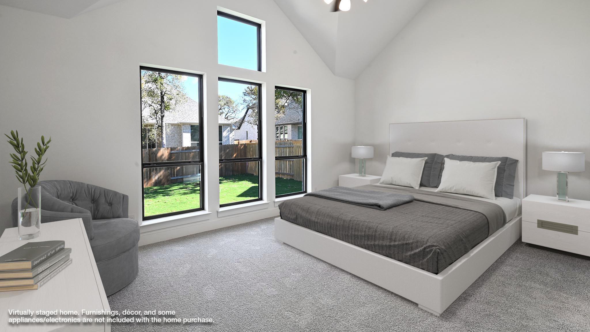 This spacious design features a two-story rotunda entry. Home office with French doors across from curved staircase. Open kitchen offers corner walk-in pantry, 5-burner gas cooktop, generous counter space and inviting island with built-in seating space. Two-story dining area opens to two-story family room with a wood mantel fireplace and sliding glass door. First-floor primary suite includes bedroom with 13-foot ceiling and wa...