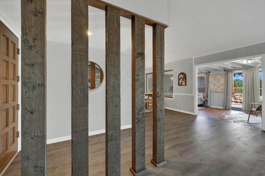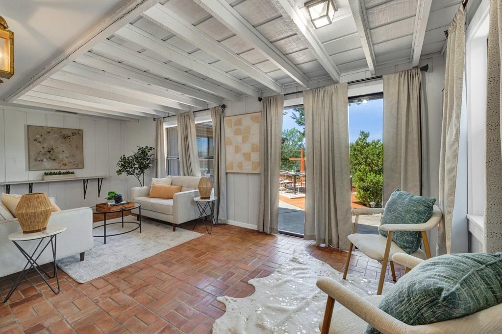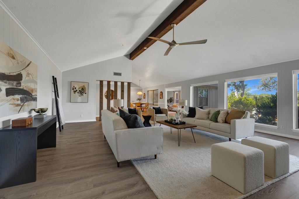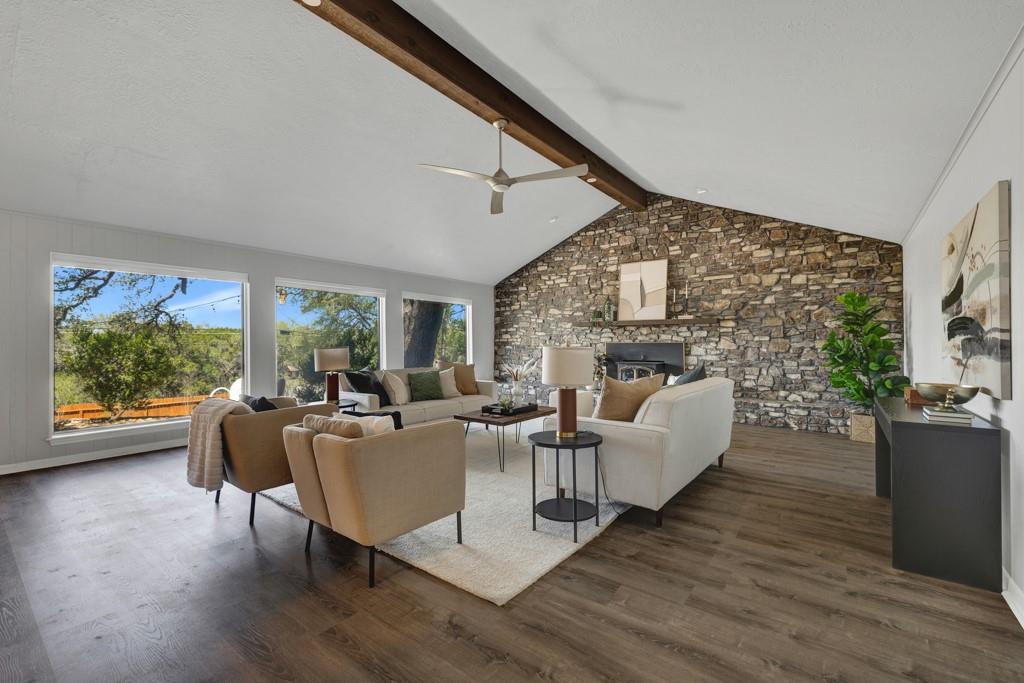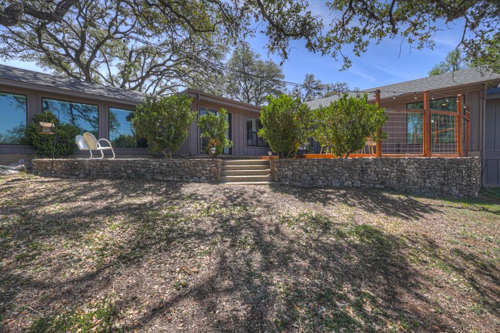 Renovated Mid-Century Ranch at the Top of Tanglewood. This one sits at the highest point in Tanglewood, one mile northwest of Texas State University, backing to undeveloped property on a larger lot shaded by gorgeous old trees — plus 20 new trees, planted and growing. The living room makes a statement: vaulted beamed ceilings, floor-to-ceiling stone hearth. It earns the word "wow." The kitchen was completely reconfigured — no...