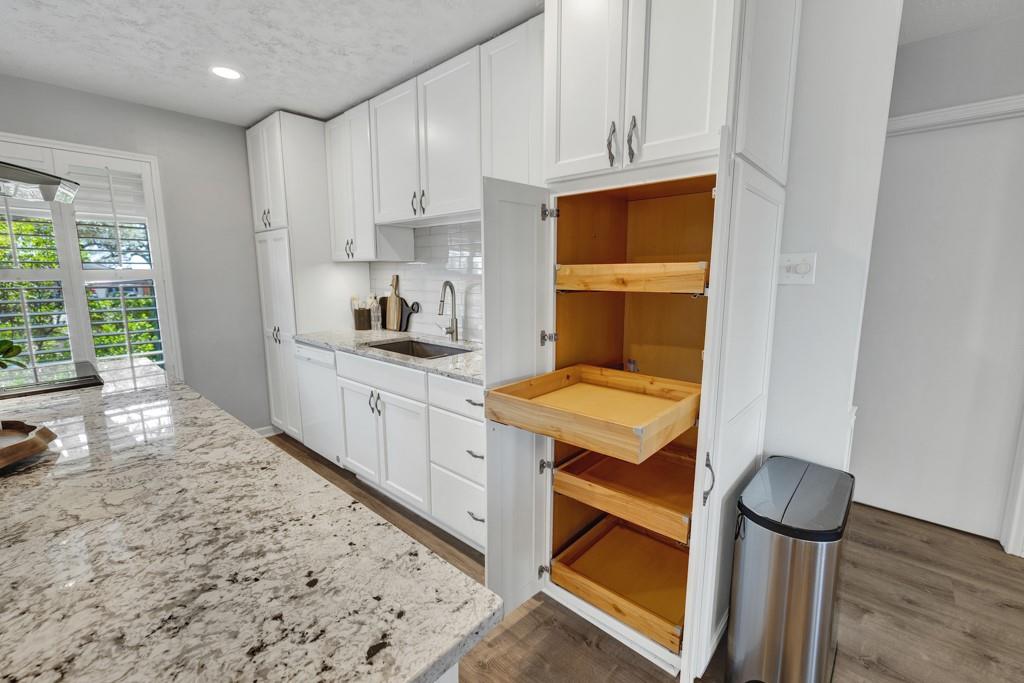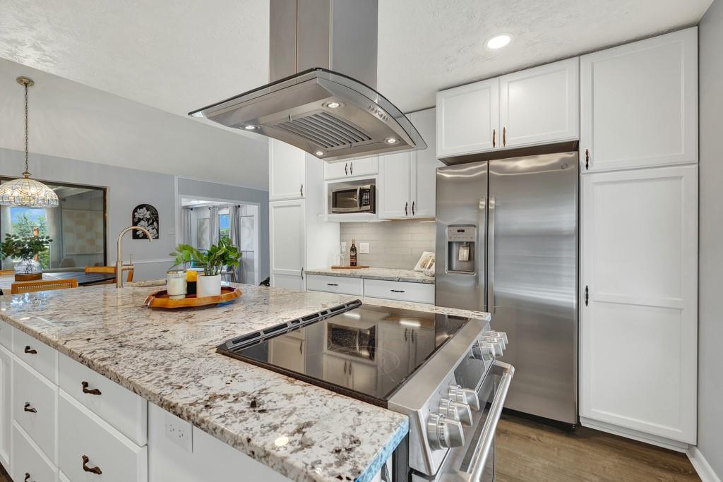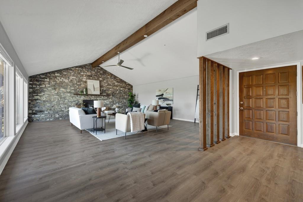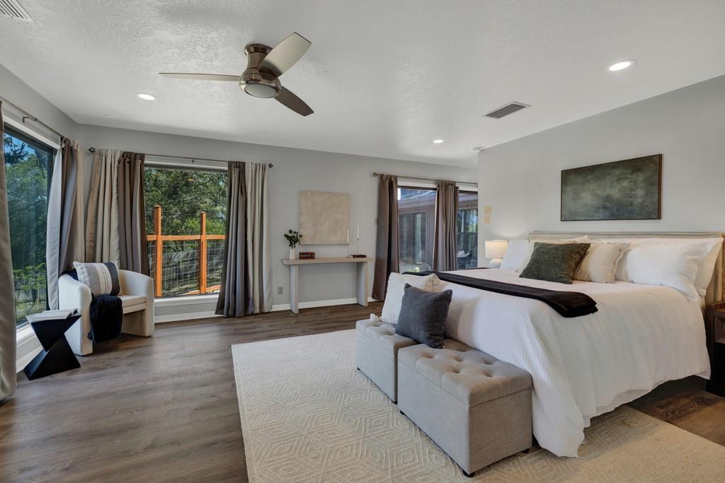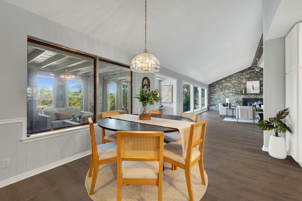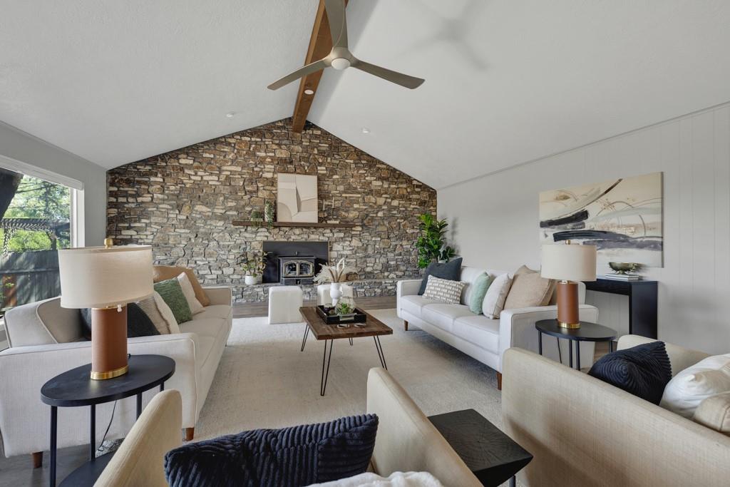 Renovated Mid-Century Ranch at the Top of Tanglewood. This one sits at the highest point in Tanglewood, one mile northwest of Texas State University, backing to undeveloped property on a larger lot shaded by gorgeous old trees — plus 20 new trees, planted and growing. The living room makes a statement: vaulted beamed ceilings, floor-to-ceiling stone hearth. It earns the word "wow." The kitchen was completely reconfigured — no...