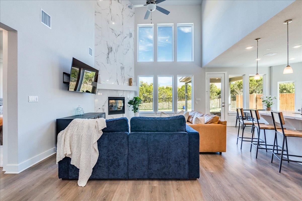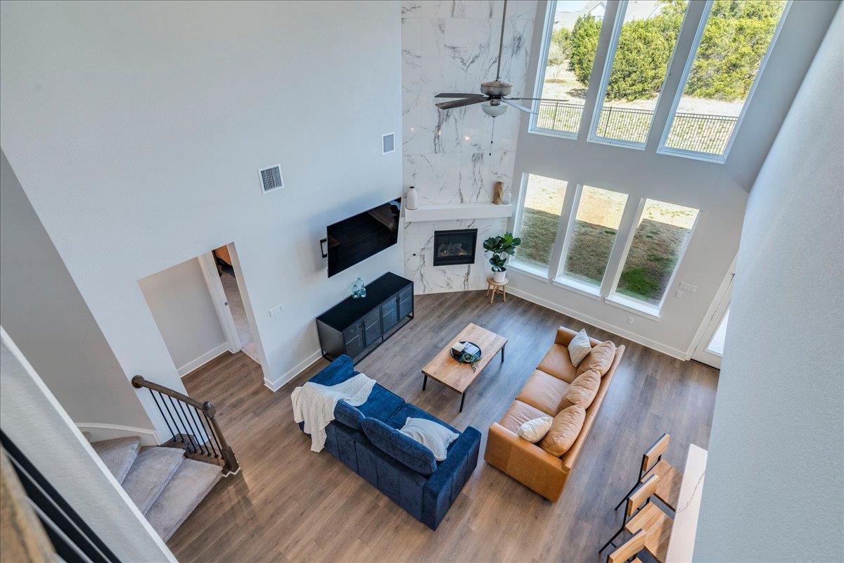 Set on a quiet street in Dripping Springs’ premier Headwaters community, this open-concept 5-bedroom, 4-bathroom home blends elevated design with easy Hill Country living in top-rated Dripping Springs ISD. A dramatic foyer with soaring ceilings and a sweeping curved staircase opens to a light-filled living area anchored by a marble-accented fireplace and expansive windows framing serene greenbelt views. The chef’s kitchen cen...