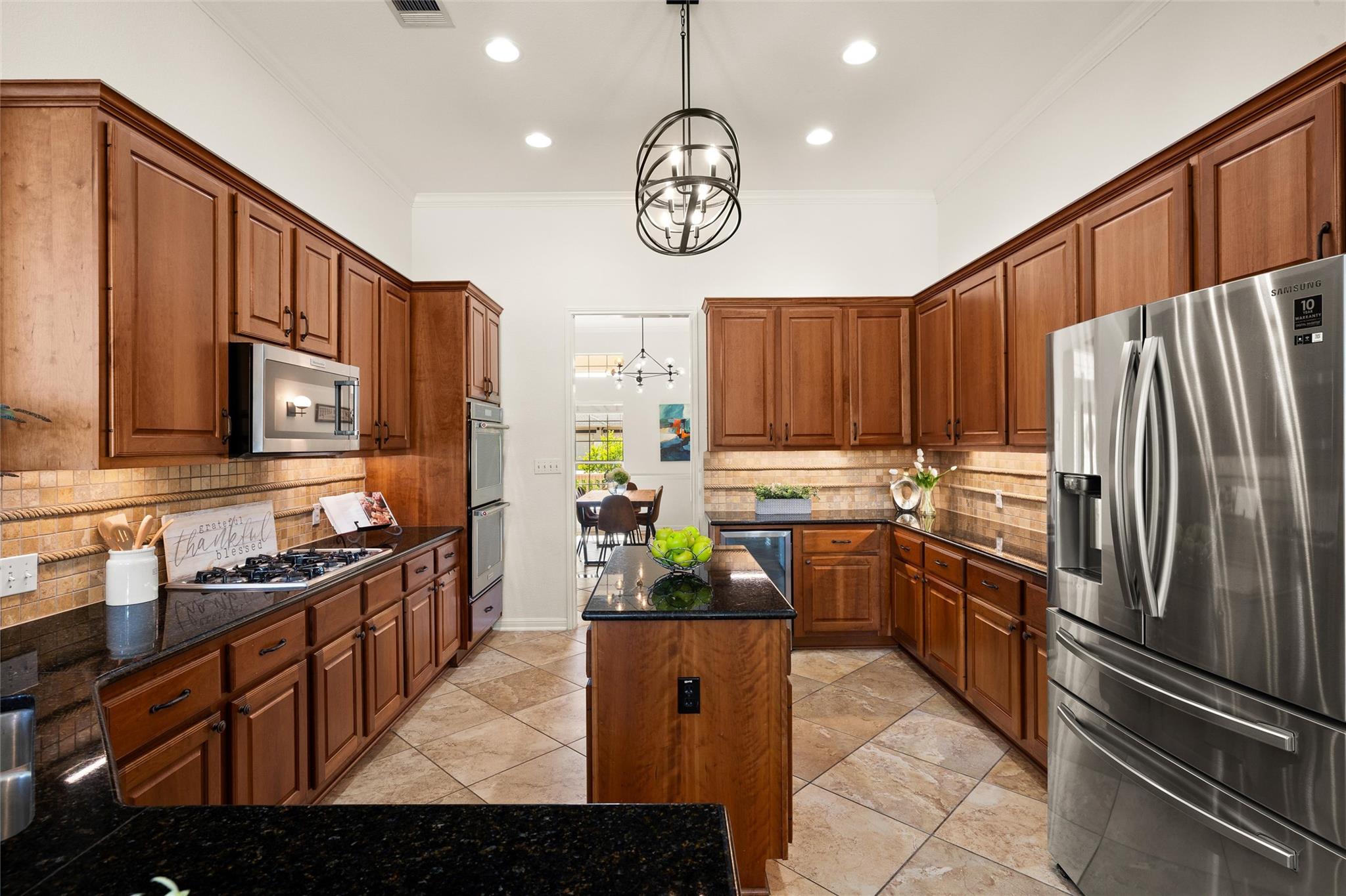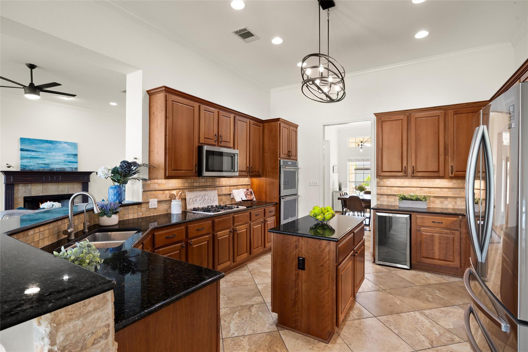 Set against a peaceful greenbelt backdrop, this beautifully designed home offers an exceptional blend of elegance, comfort, and resort-style living. The open-concept floor plan is centered around a spacious family room that flows seamlessly into the well-appointed kitchen, featuring built-in ovens, a gas range, wine fridge, large center island, and a sunny breakfast nook for casual dining. A formal dining room off the foyer pr...
