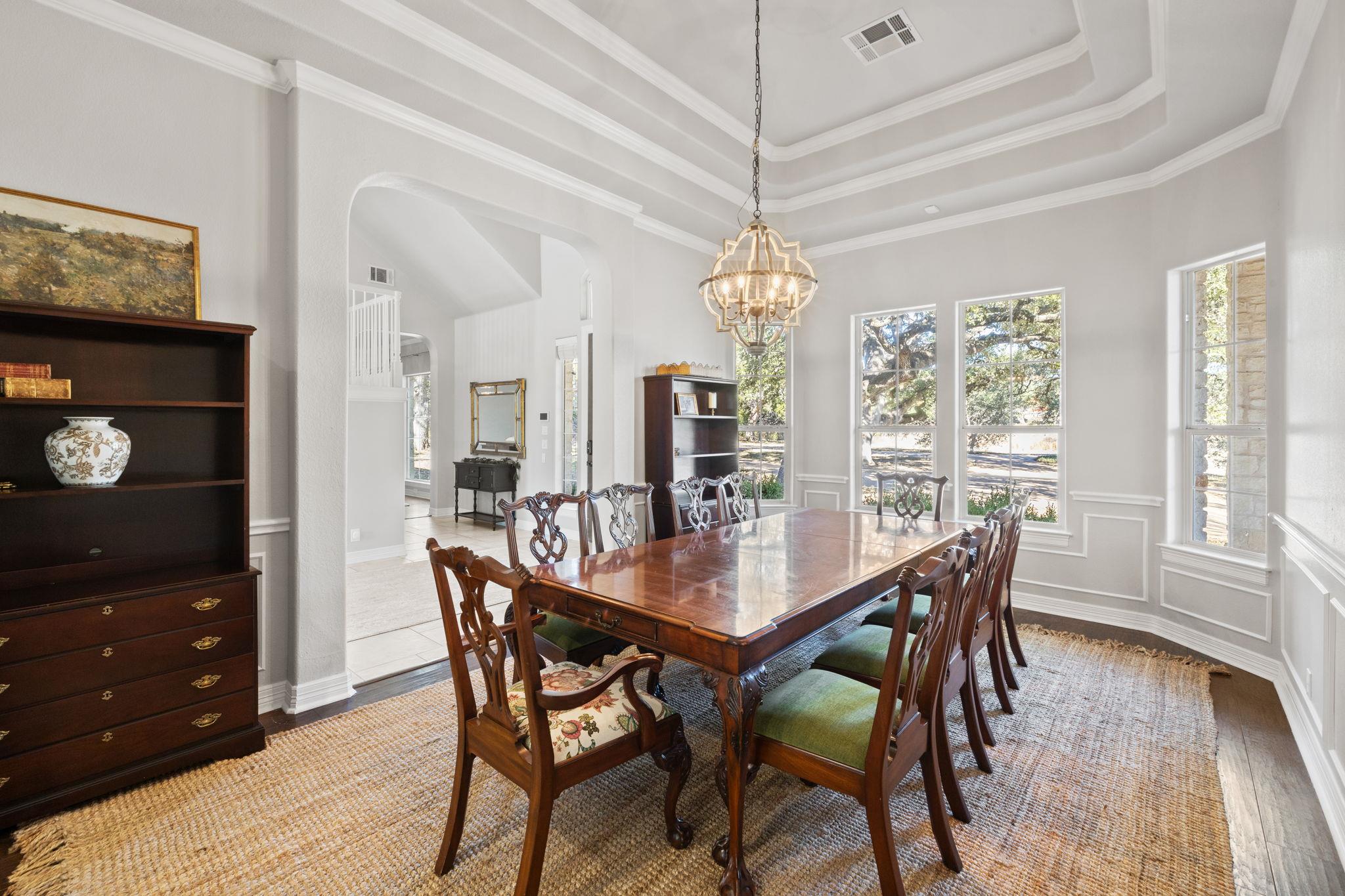 - Bookcases, Built-in Features, Cathedral Ceiling(s), Ceiling-High, Crown Molding, In-Law Floorplan, Kitchen Island, Multiple Dining Areas, Multiple Living Areas, Primary Bedroom on Main, Recessed Lighting, Walk-In Closet(s)