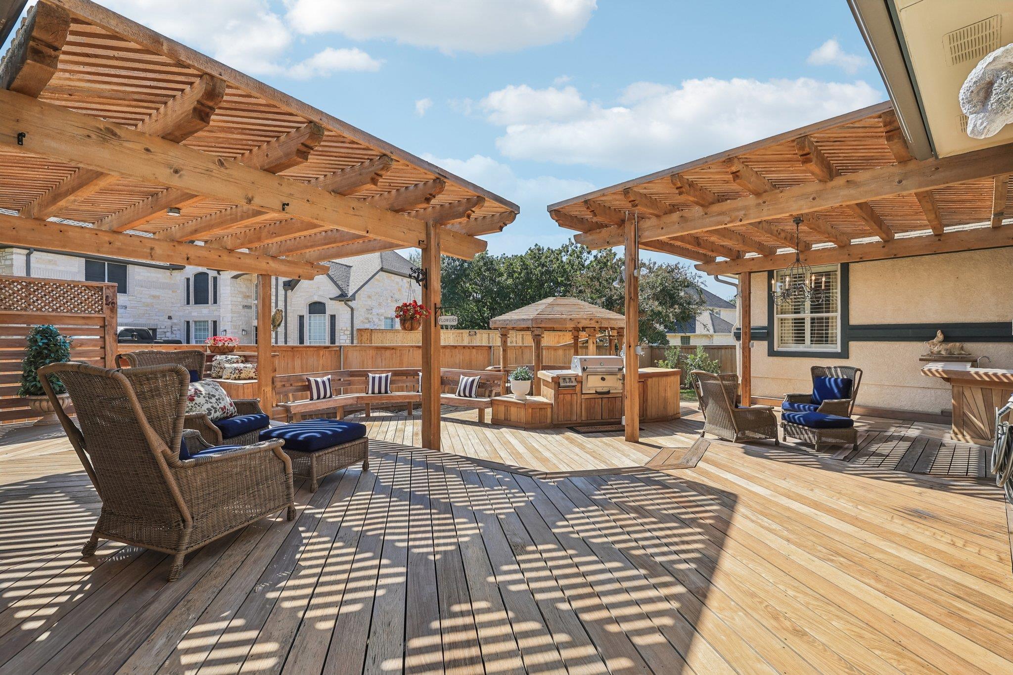 Experience premier Round Rock living in this exceptional single-story home, located on a quiet corner, cul-de-sac lot inthe established LAKE FOREST community. This home is an entertainer's dream, highlighted with incredible outdoorliving space. Step outside onto a massive, custom-built multi-level deck featuring dual pergolas, extensive seatingareas, and a built-in outdoor kitchen with a grill. Adding a unique value is the det...