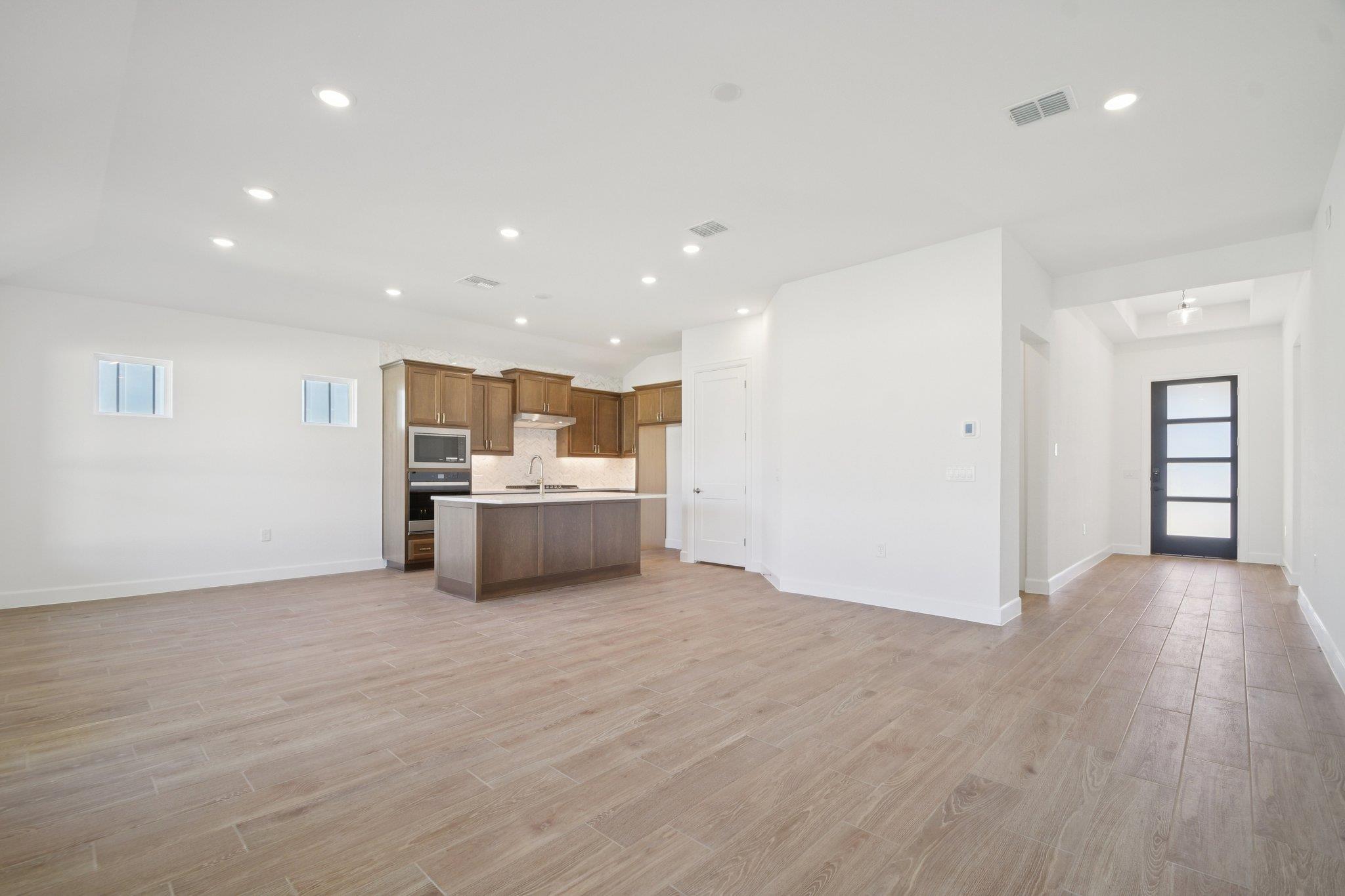 Rhodes plan with upgraded kitchen, quartz countertops, optional tray ceiling in foyer, full gutters, enlarged covered patio, upgraded tile floors throughout