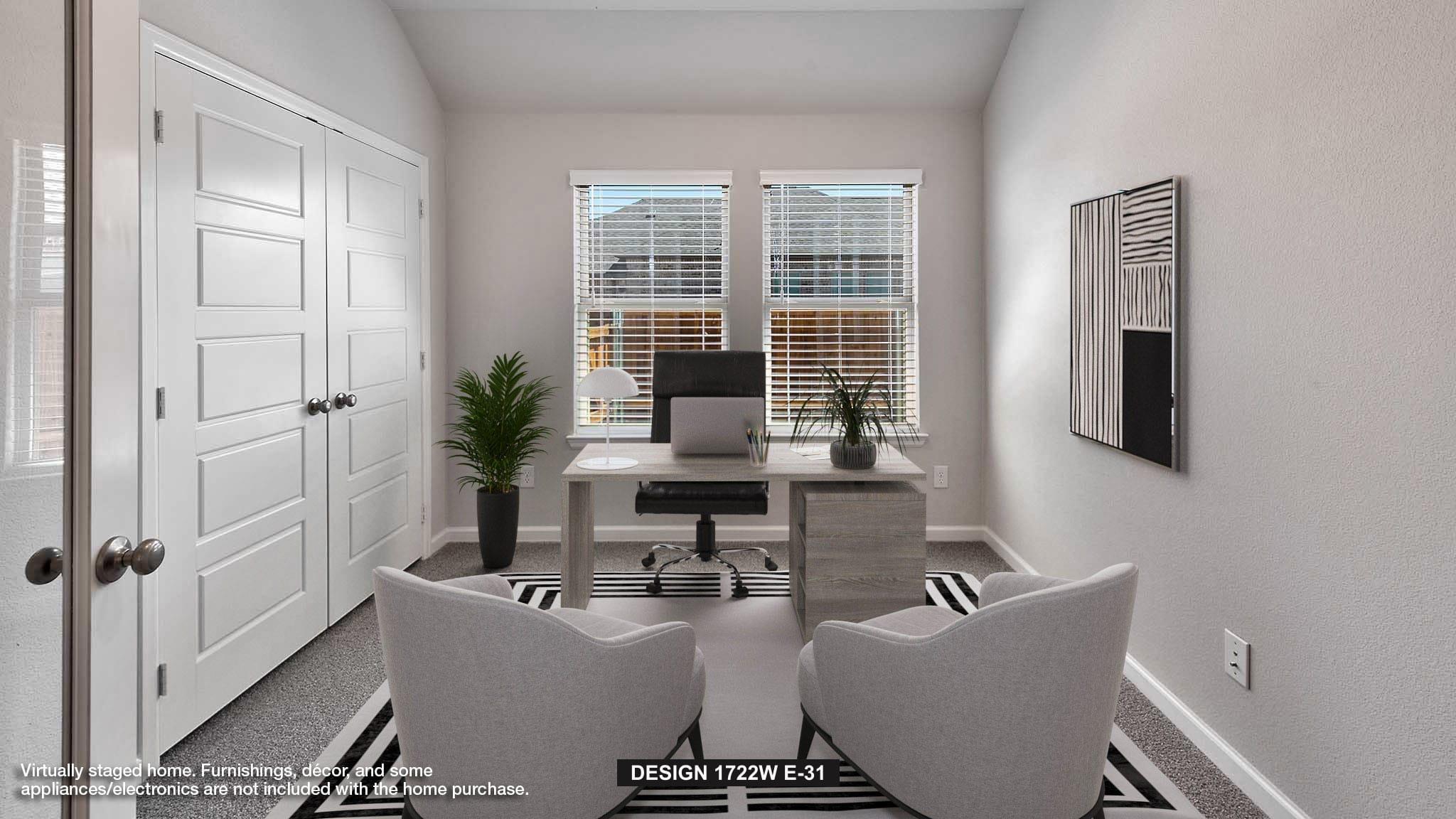 Entry leads past utility room and mud room. Home office with French door entry. Large family room opens to dining area. Kitchen hosts a corner walk-in pantry. Secluded primary suite. Primary bath features dual vanities, a walk-in closet, linen closet, and a large glass enclosed shower. Secondary bedrooms with walk-in closets. Covered backyard patio. Two-car garage.