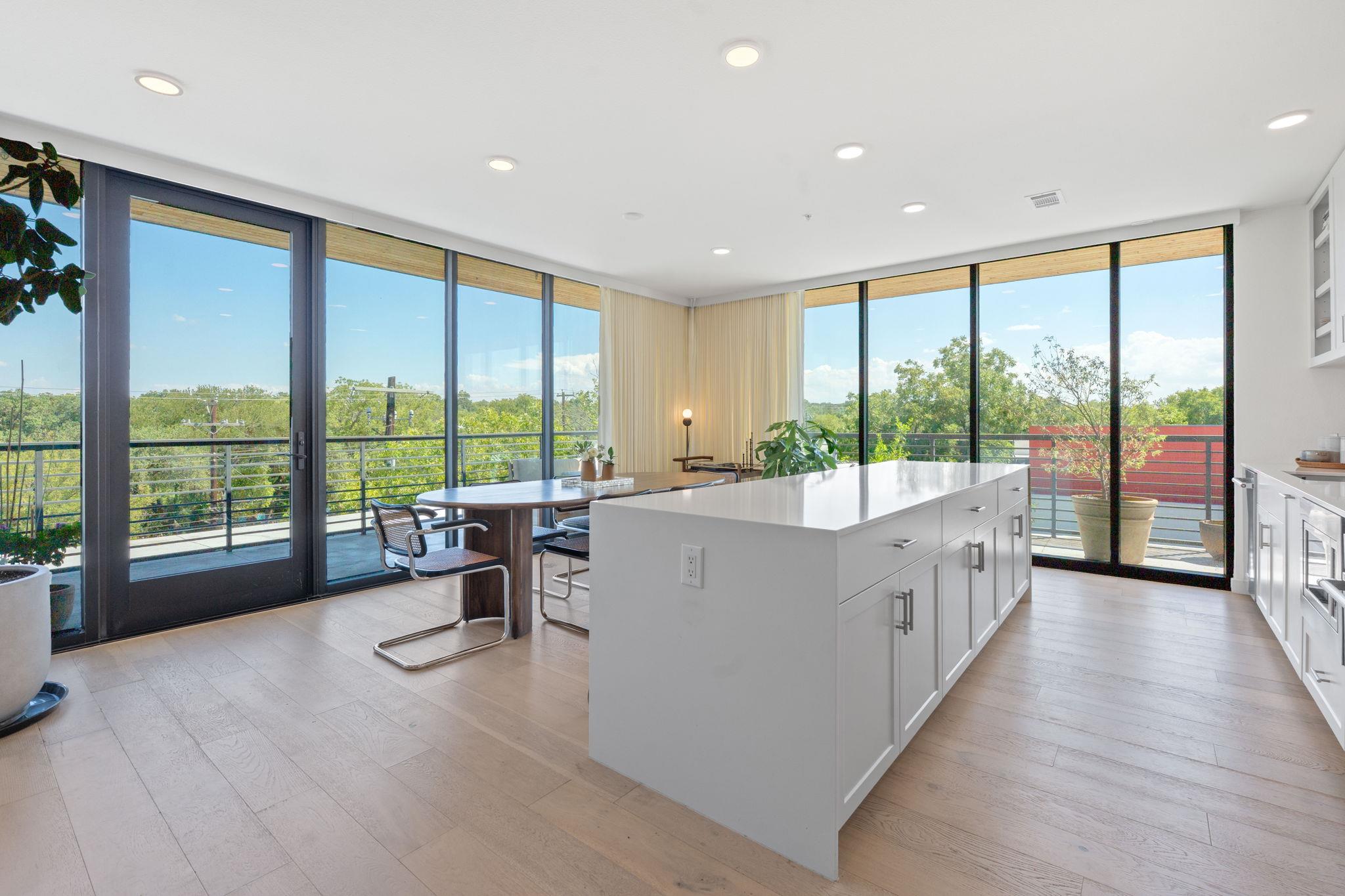 Welcome to a rare top floor, corner residence that lives like a luxury, single-family home in the heart of Austins most coveted zip codes, 78704. This spacious 3-bedroom, 2.5-bath floor plan spans has been thoughtfully remodeled with bespoke upgrades, including high end bathroom tile, chic light fixtures, a fresh backsplash, designer wallpaper, and new paint throughout. Floor-to-ceiling windows flood the home with natural lig...