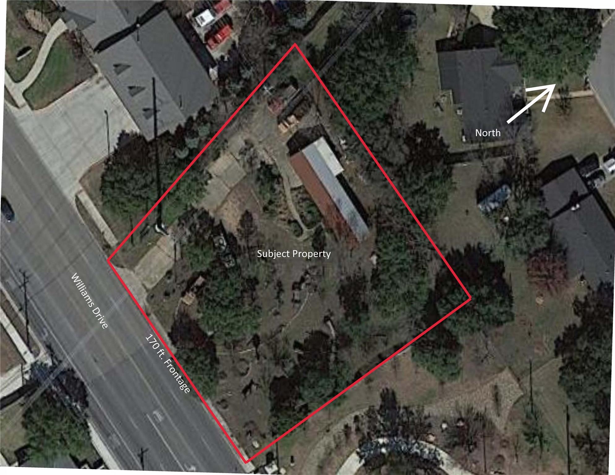 Large, very visible 0.8 acre commercial lot on very busy Williams Dr just west of IH 35. Has a 1,296 ft building that needs work but was recently used as by a law firm. Also has approx. 8 parking spaces with the potential for many more. This site also has great potential to add additional buildings and is in the City of Georgetown master plan for vertical/dense development.