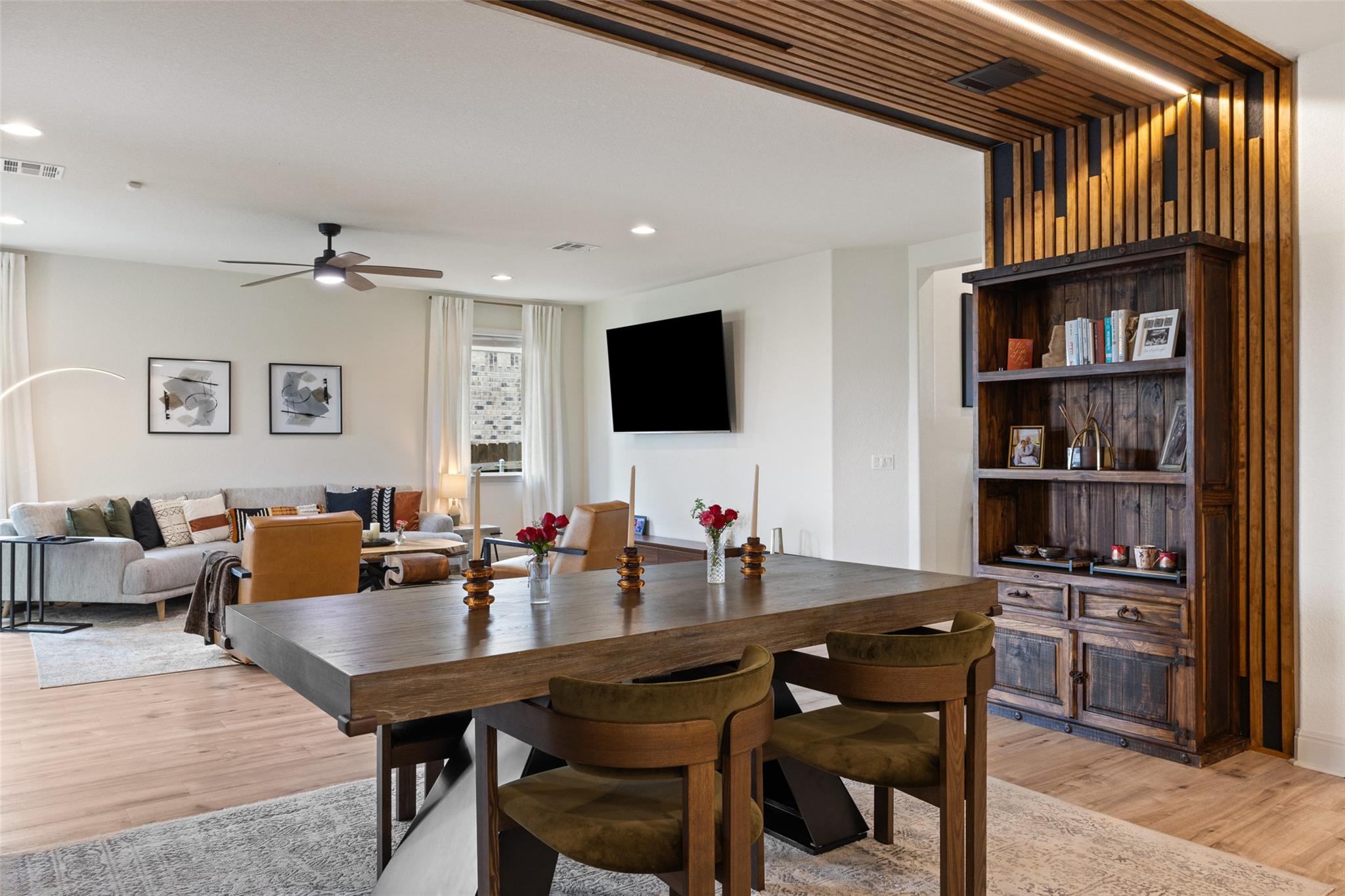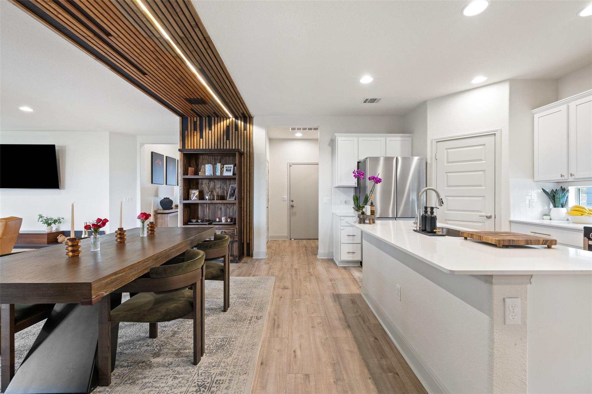 Experience unparalleled elegance in this meticulously upgraded single-story home featuring designer finishes and a spectacular backyard. Nestled against a lush greenspace with walking trails, the setting offers both privacy and serenity. Step inside to discover a welcoming, open-concept layout filled with natural light streaming through large picture windows, exuding warmth and sophistication. A striking wood accent and impres...