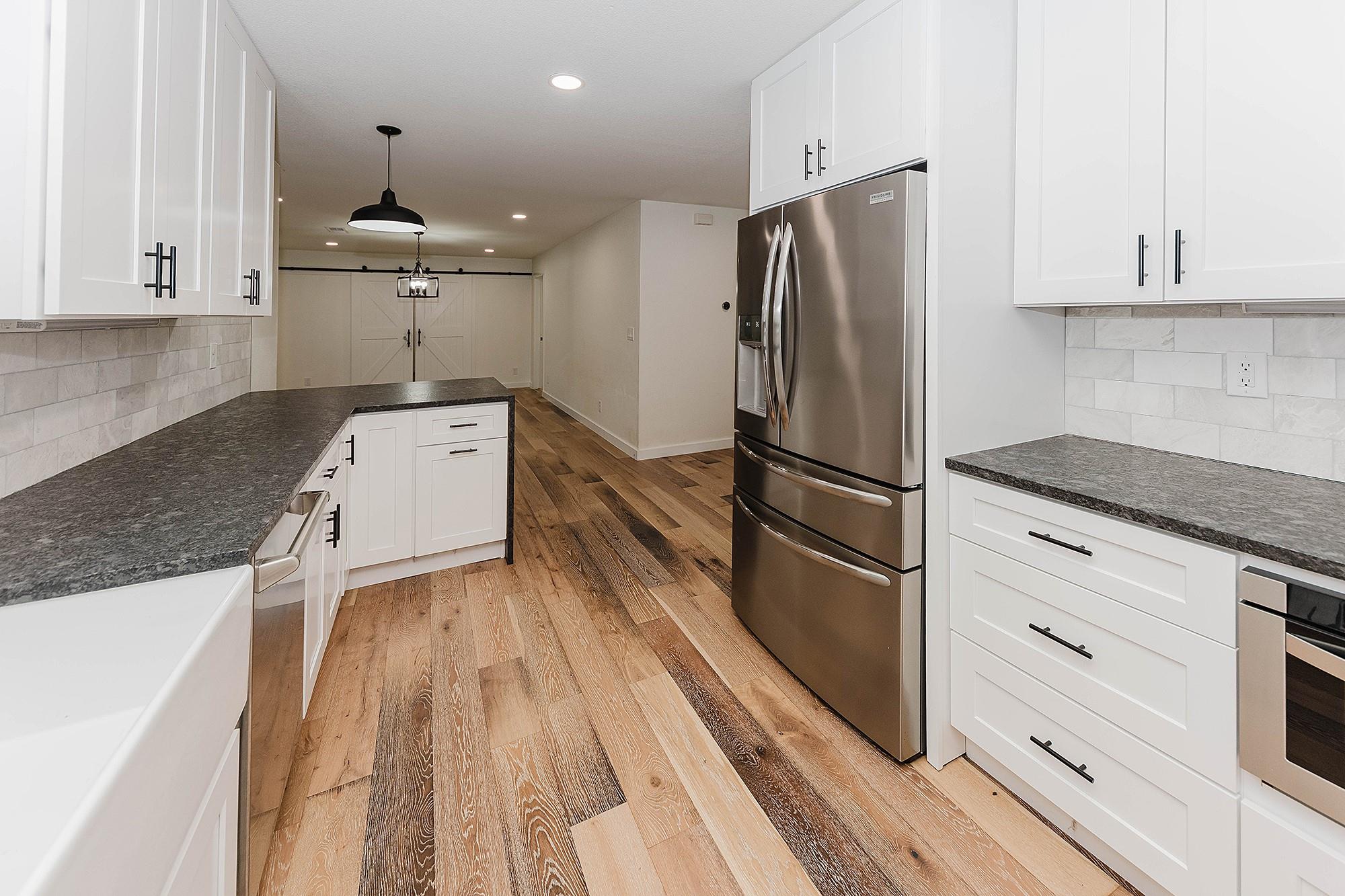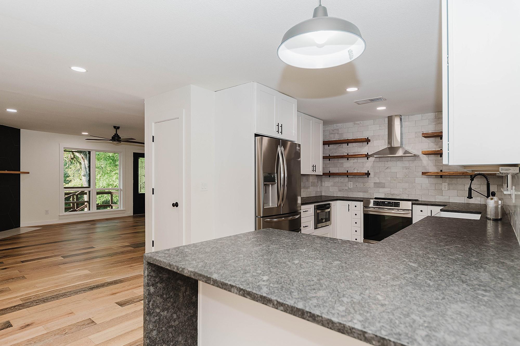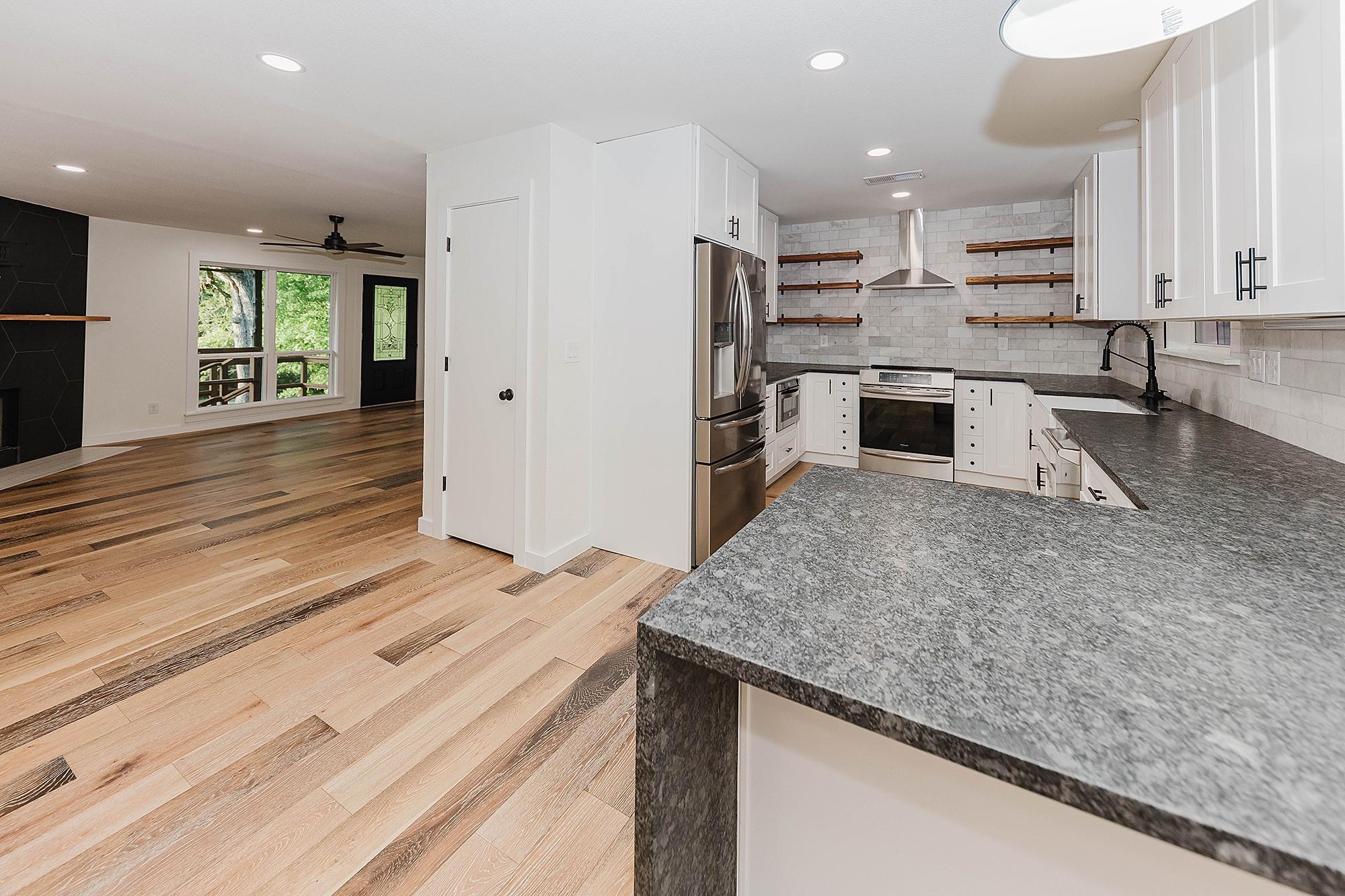 Beautifully remodeled home. Picturesque setting with a tree lined back yard and a nice deck to relax/bbq. The large covered front porch is great for entertaining and relaxing! The large open plan has been updated! The outside is a charming log home look and the inside has modern touches and updates! Pretty LVP floors for ease of maintenance. The 4th bedroom has sliding barn doors and it could be a 2nd living, home office, ...