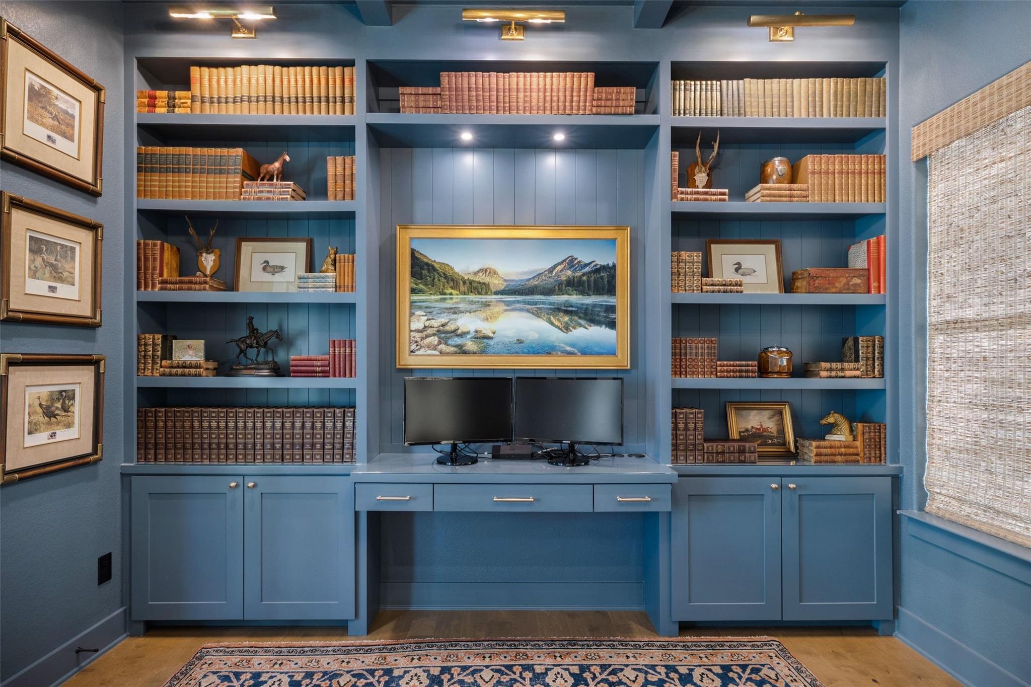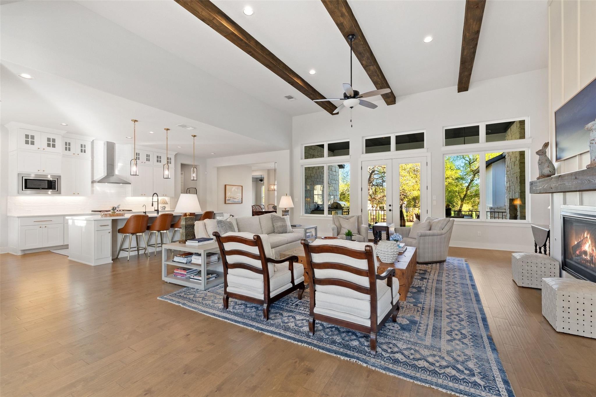 - Bookcases, Breakfast Bar, Built-in Features, Ceiling Fan(s), Beamed Ceilings, Ceiling-High, Ceiling-Vaulted, Chandelier, Quartz Counters, Double Vanity, Kitchen Island, Multiple Living Areas, +9 more