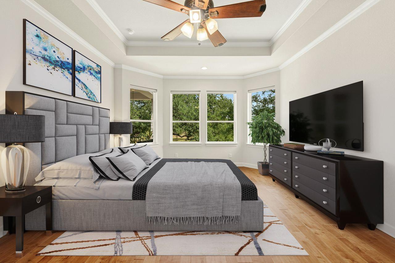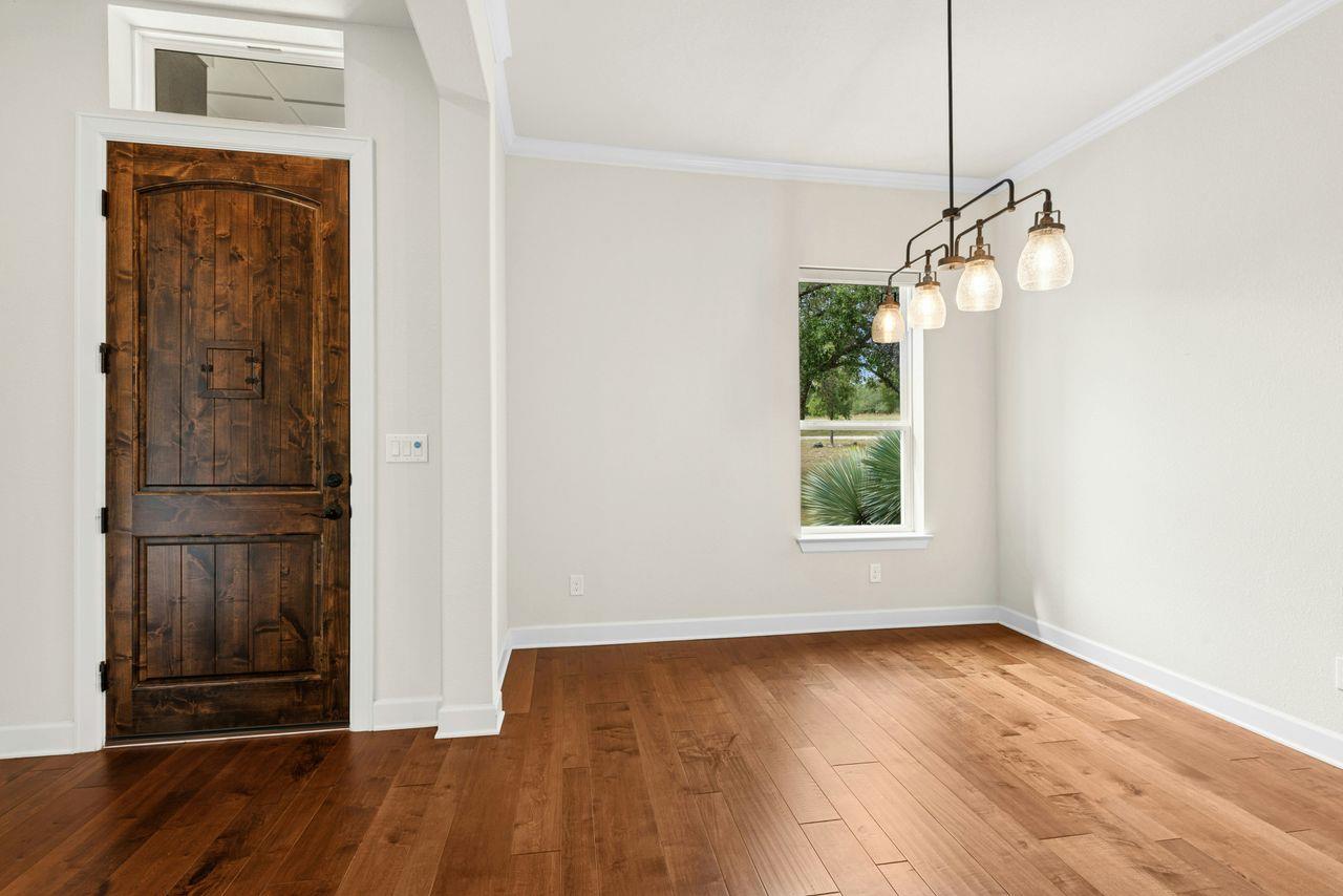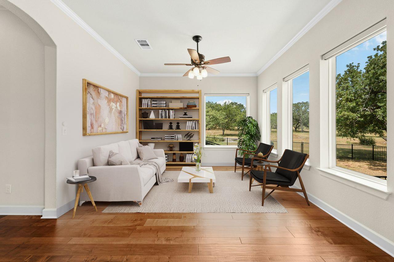 Tucked beneath a canopy of more than 100 live oaks, this stunning 2,730 sq. ft. David Weekley custom home sits on 6.89 spectacular acres in the sought-after gated community of Double Horn. The one-of-a-kind lot is cleared, private, has a lovely wet weather creek, and is at the end of a cul-de-sac. With modern upgrades and an easy flow for entertaining, the single story stunner blends Hill Country tranquility with everyday con...