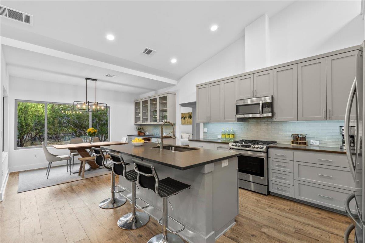 - Bookcases, Breakfast Bar, Ceiling Fan(s), Ceiling-High, Ceiling-Vaulted, Chandelier, Double Vanity, Eat-in Kitchen, Kitchen Island, Open Floorplan, Pantry, Primary Bedroom on Main, +3 more