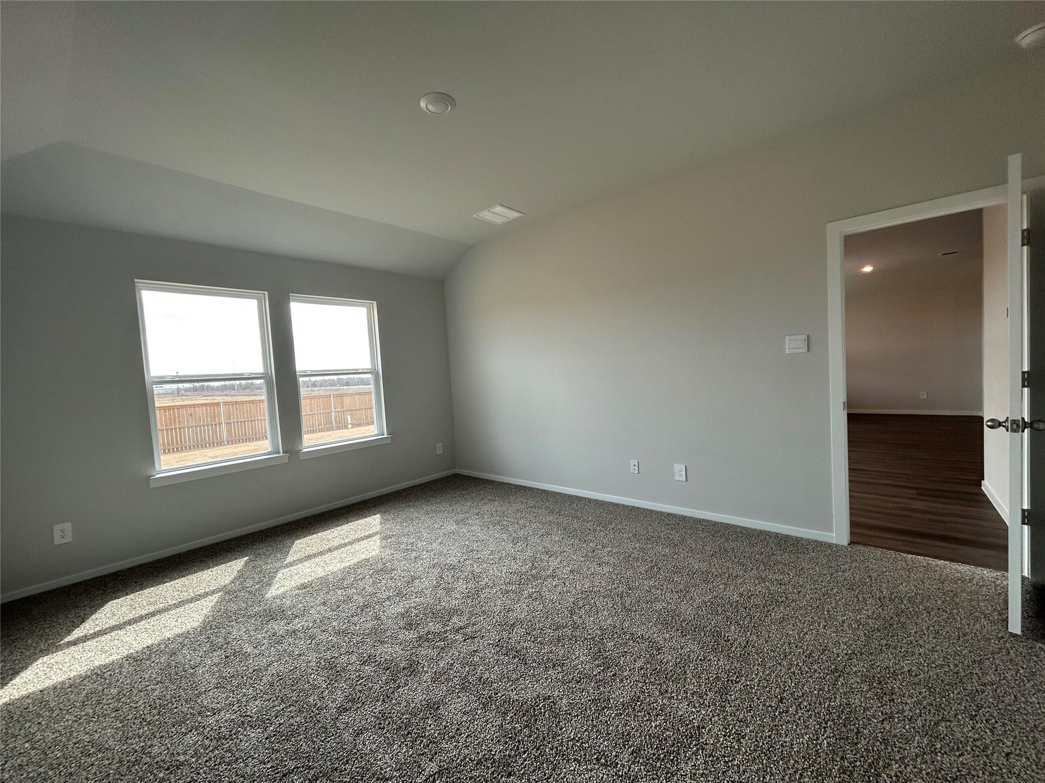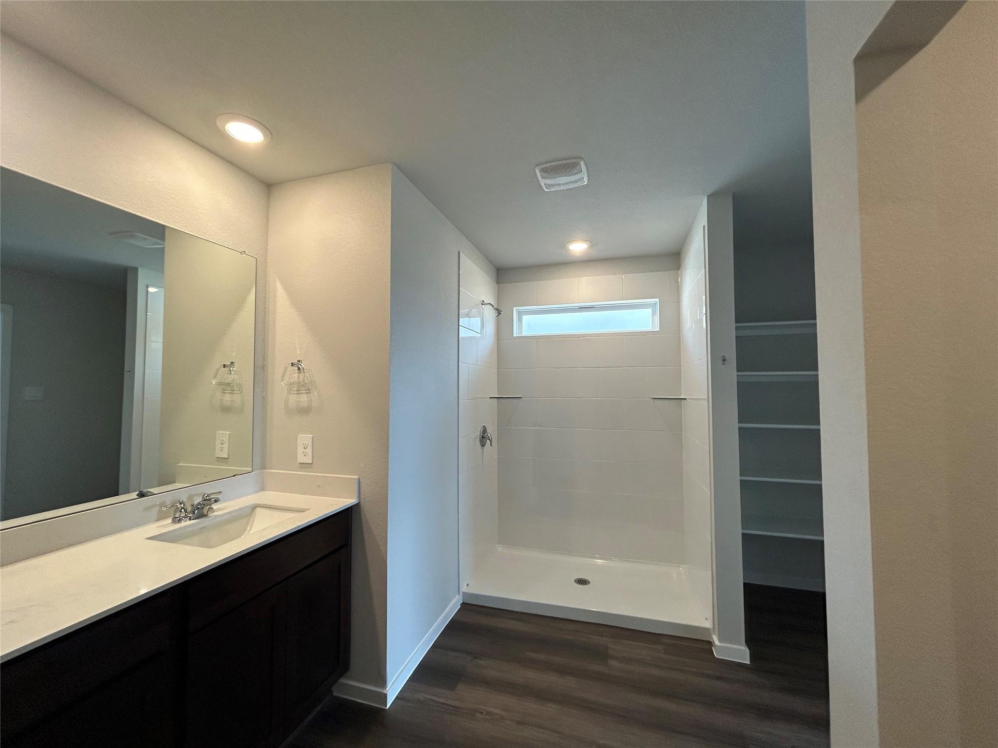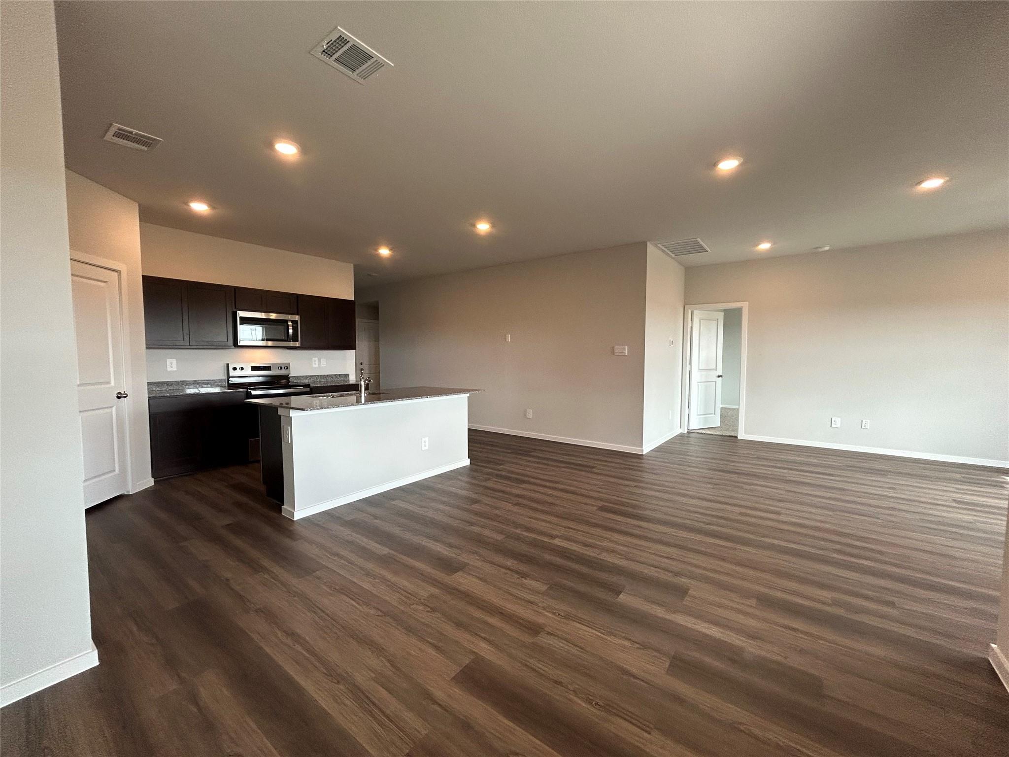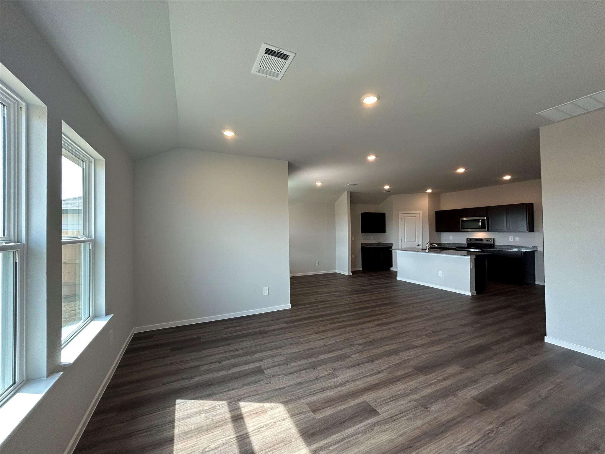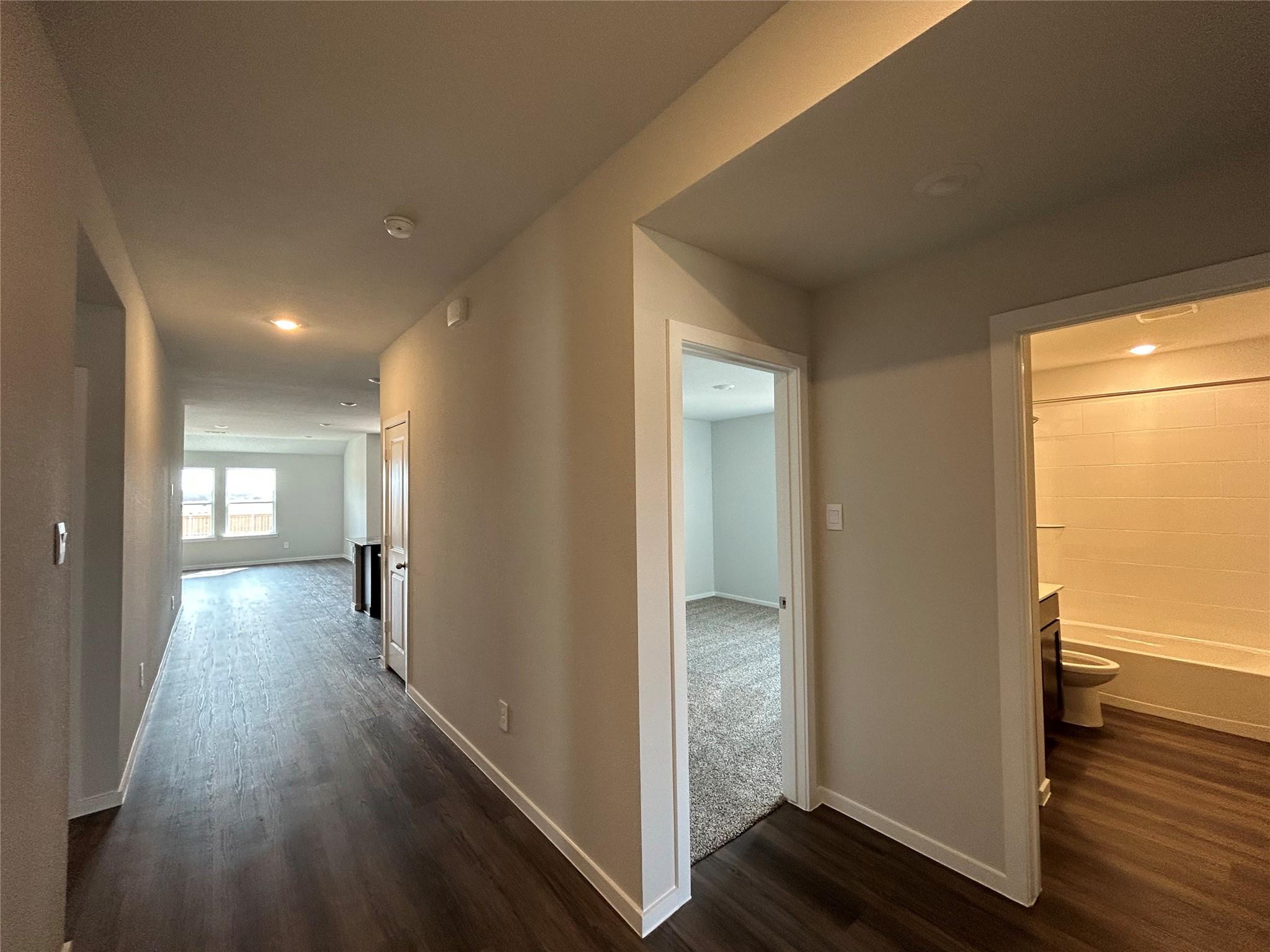 The Texas Cali is a single-story, 4-bedroom, 2-bathroom home that features approximately 1,796 square feet of living space. The long foyer with an entry coat closet leads to the open concept kitchen, living room and breakfast area. The kitchen includes a breakfast bar and corner pantry. The main bedroom, bedroom 1, features a sloped ceiling and attractive bathroom with dual vanities and spacious walk-in closet. The standard co...
