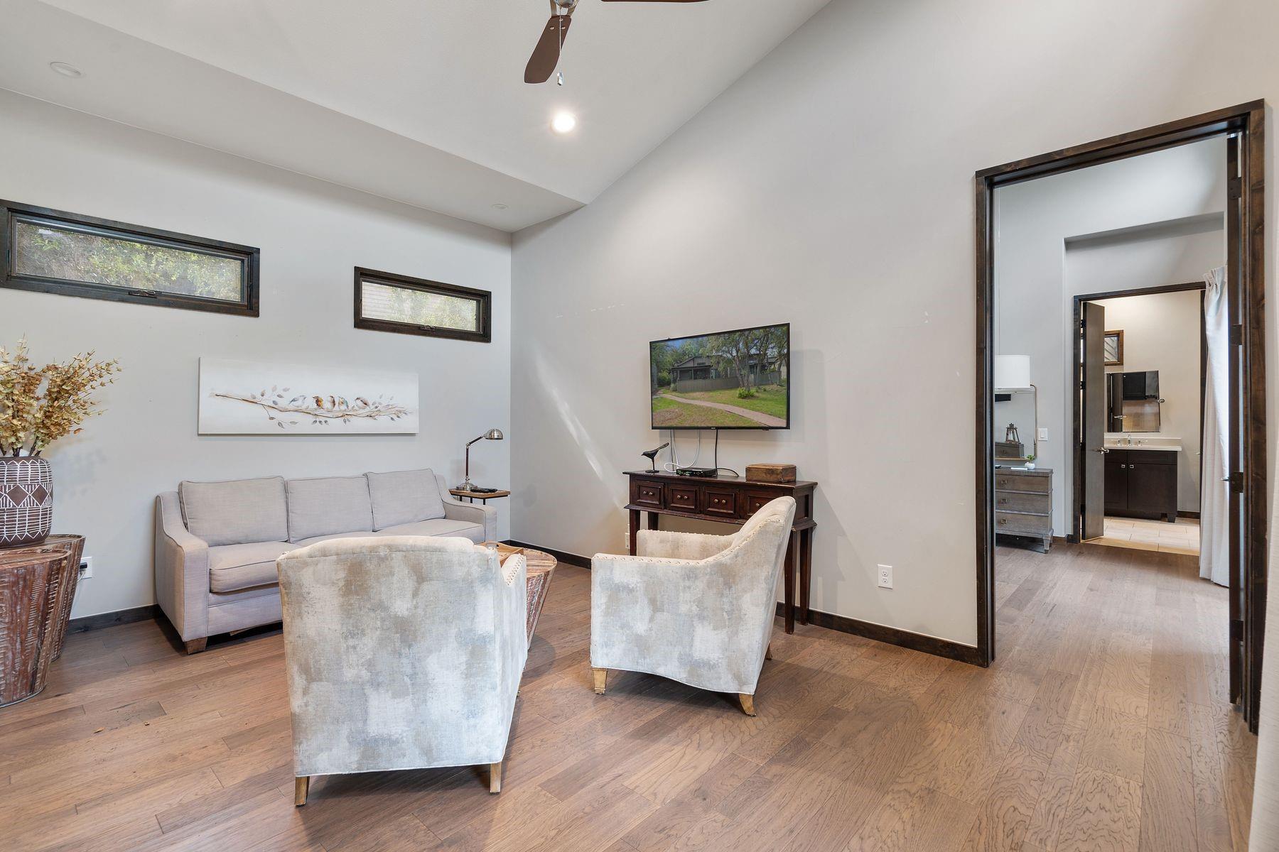 Introducing "The Cabin" at The Reserve at Lake Travis: This high-end, free-standing, and fully furnished "cabin" in the prestigious The Reserve of Lake Travis offers stunning views, serene green spaces, two large bedrooms with en-suite bathrooms, and a spacious living room with a well-equipped kitchenette. The primary bedroom is a luxurious retreat, bathed in natural light, with an en-suite bathroom that features elegant doubl...