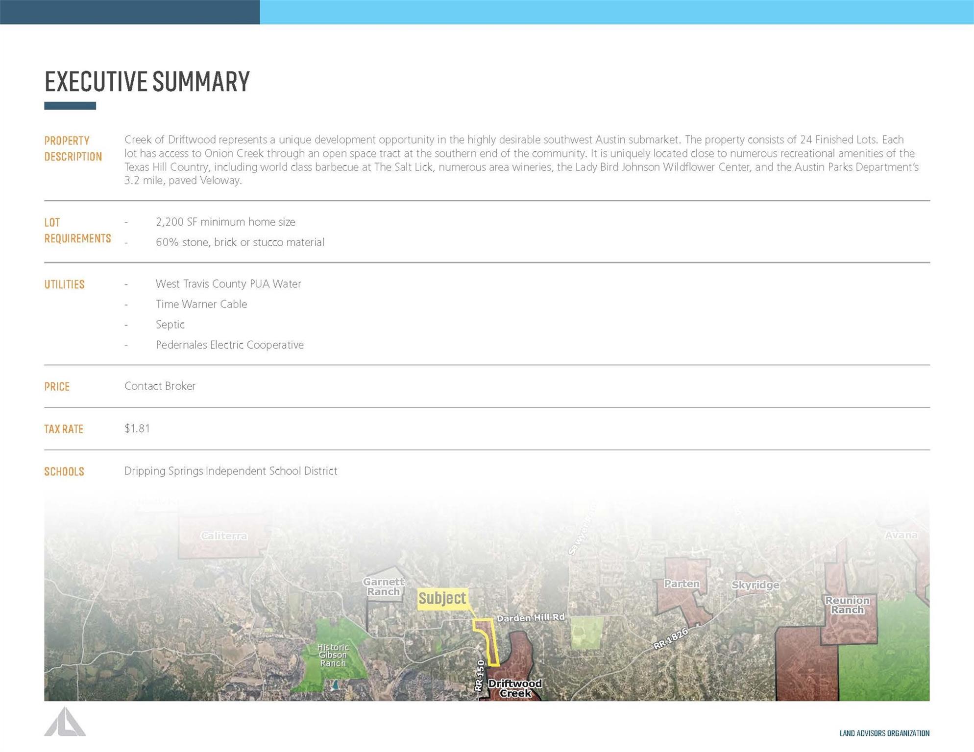 Creek of Driftwood is a unique development opportunity in the highly desirable southwest Austin submarket. A private gated community that has access to Onion Creek through an open space tract at the southern end of the community. This lot is partially impacted by FEMA floodplain. There are additional lots available, contact agent for more information.