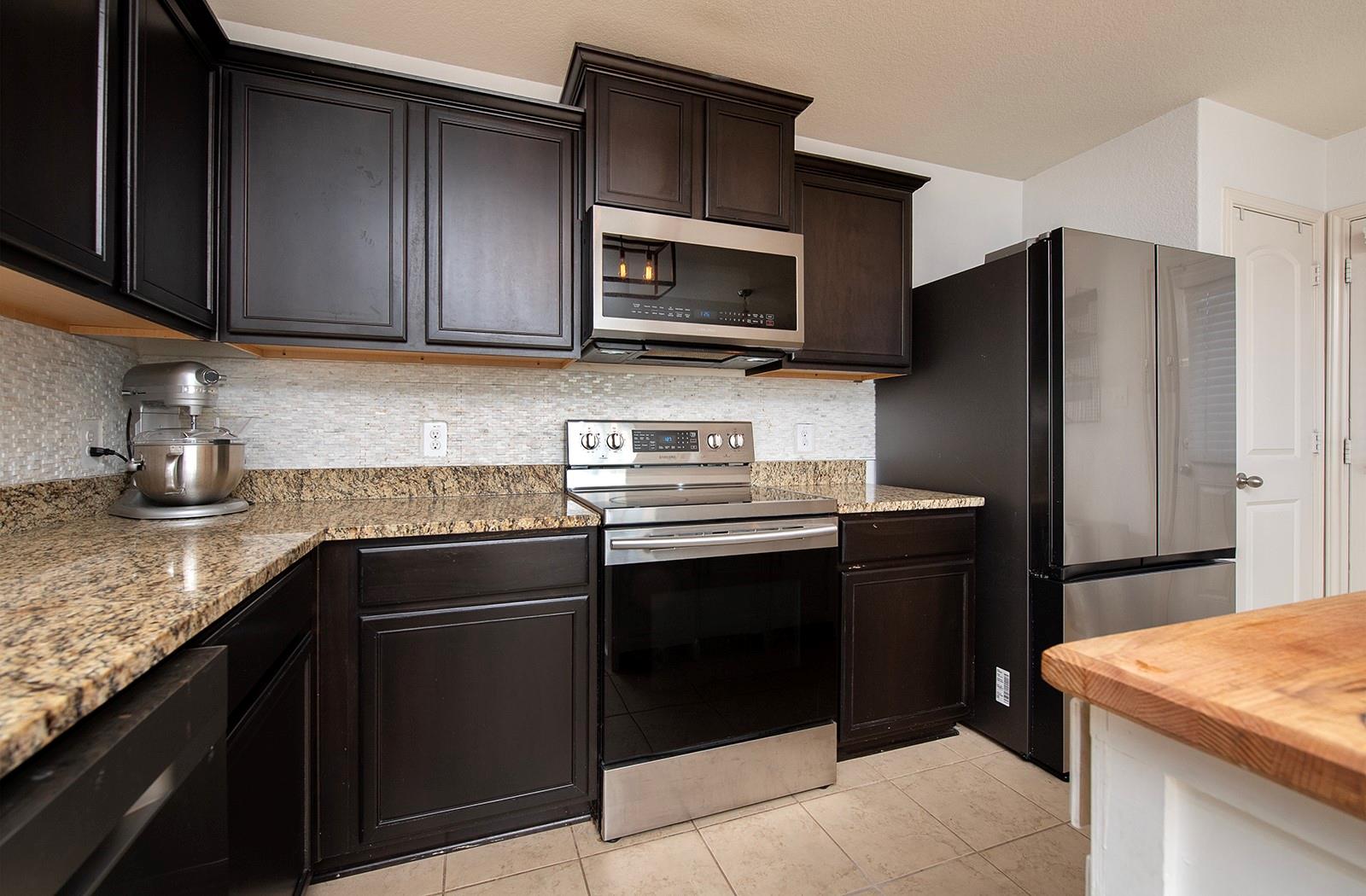- Dishwasher, Disposal, Exhaust Fan, Microwave, Free-Standing Electric Range, Wine Cooler
