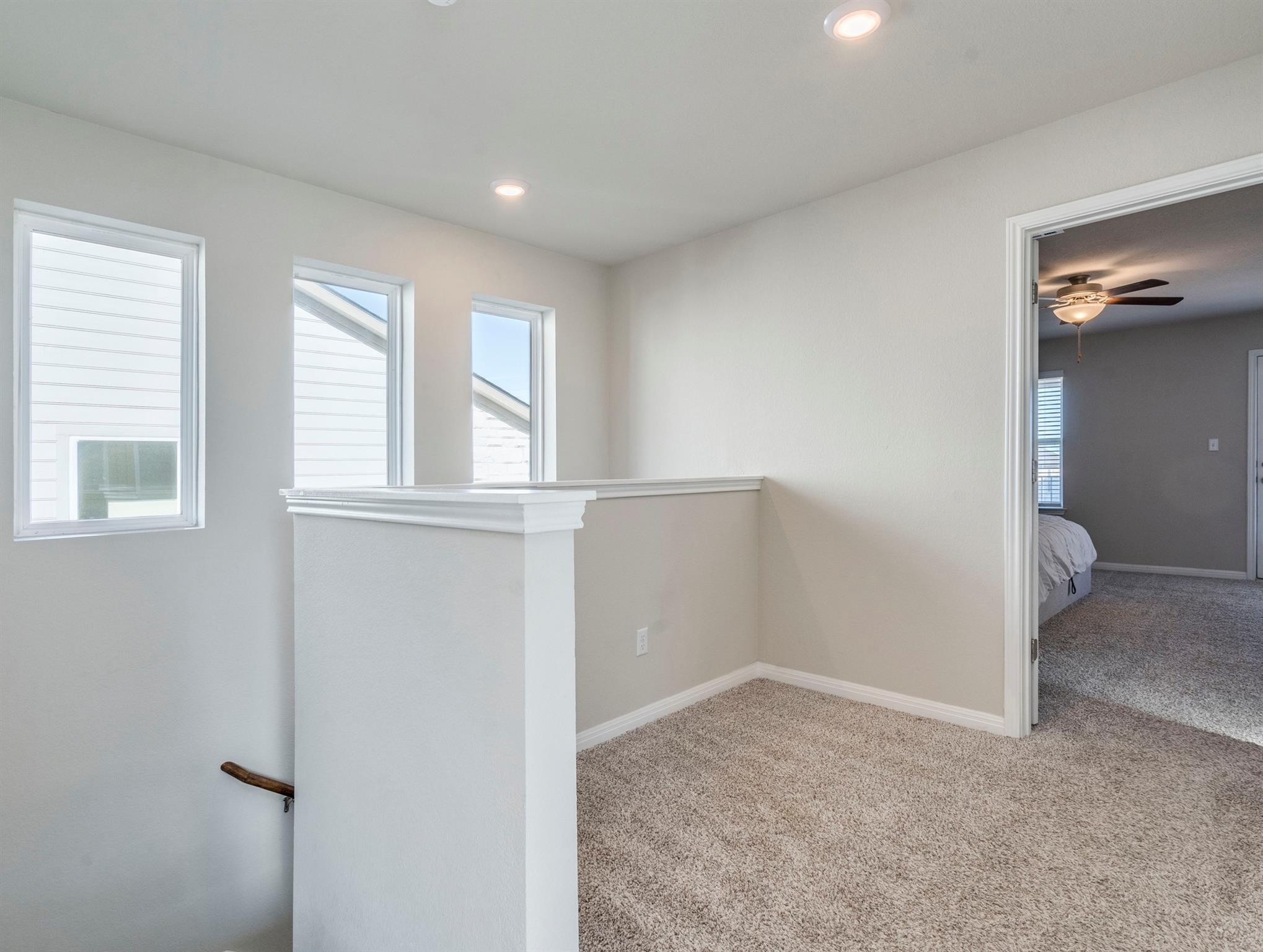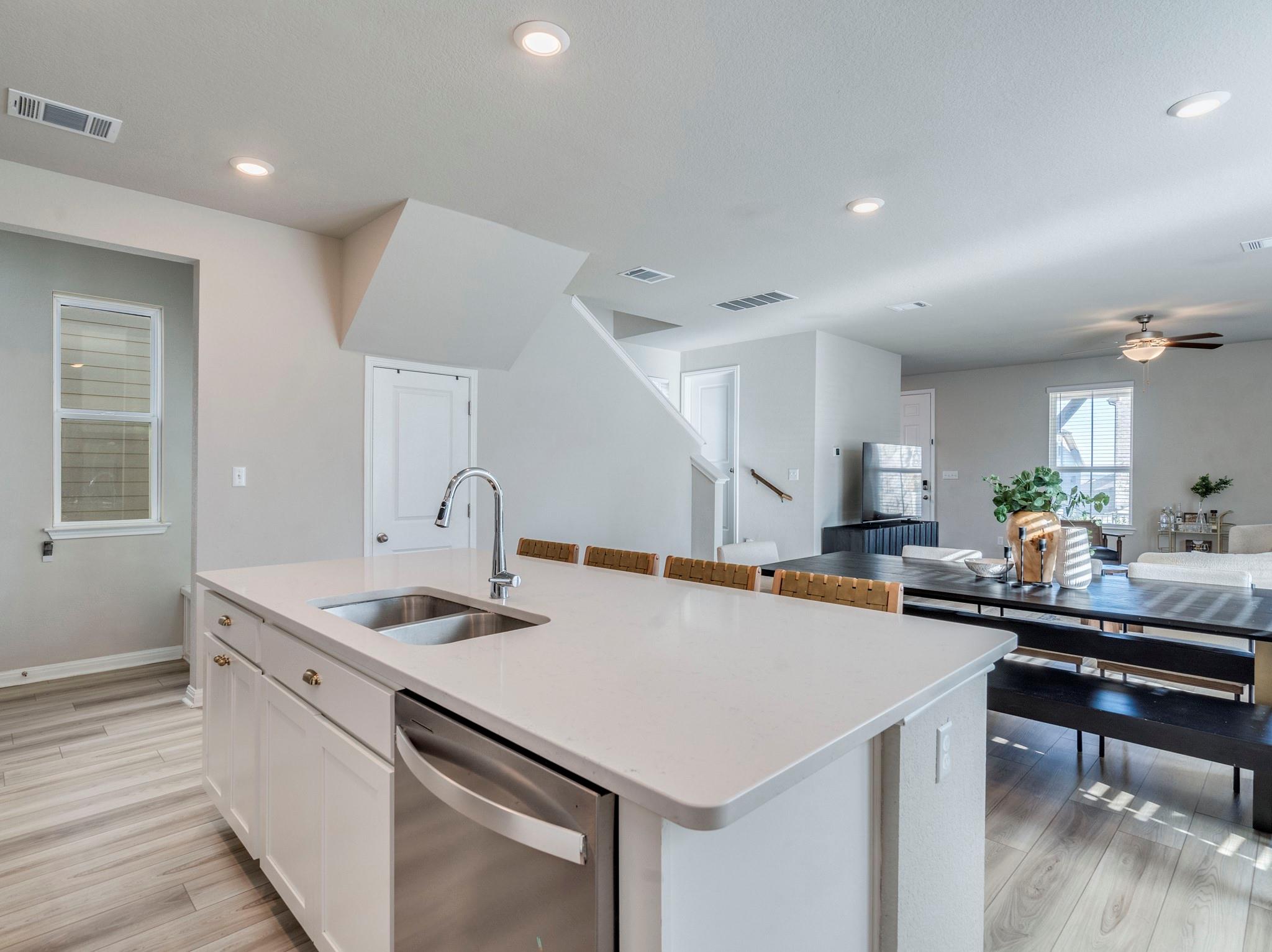 - Breakfast Bar, Ceiling Fan(s), Ceiling-High, Quartz Counters, Interior Steps, Kitchen Island, Multiple Living Areas, Open Floorplan, Pantry, Walk-In Closet(s)