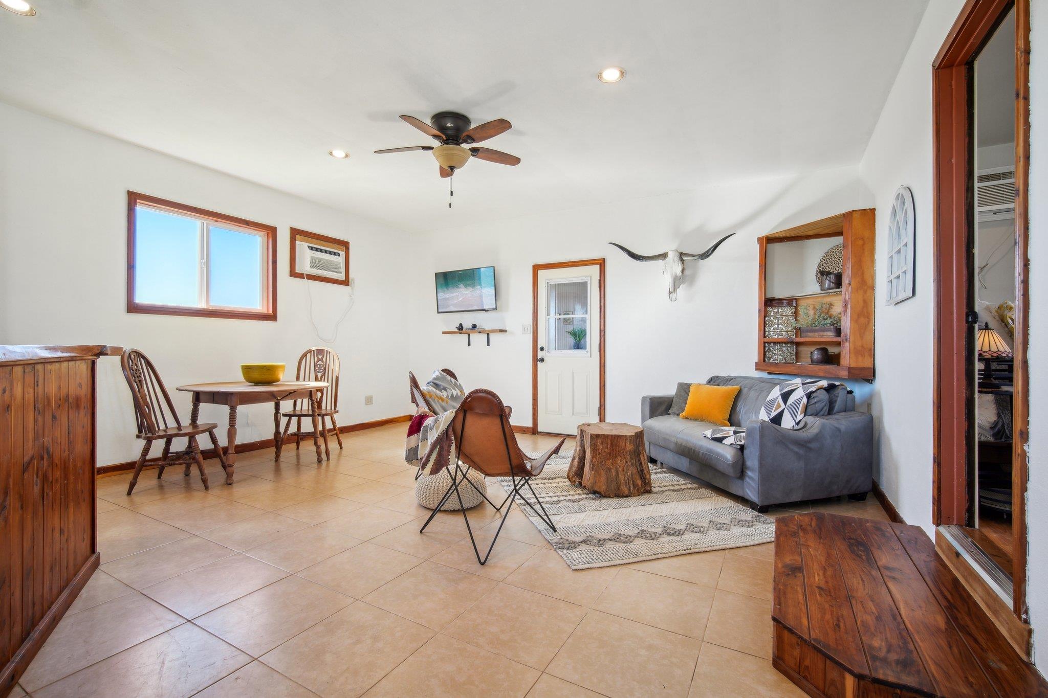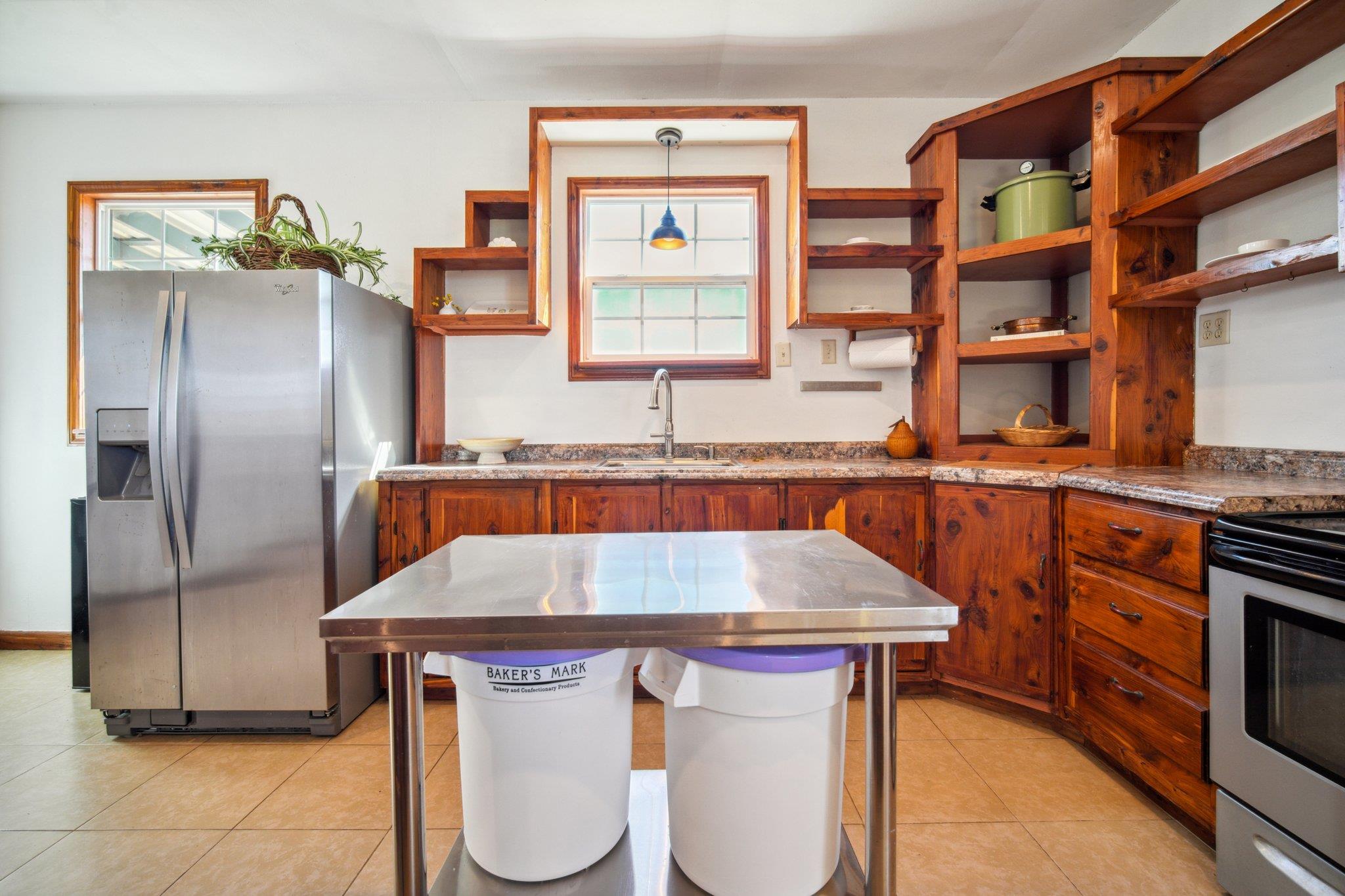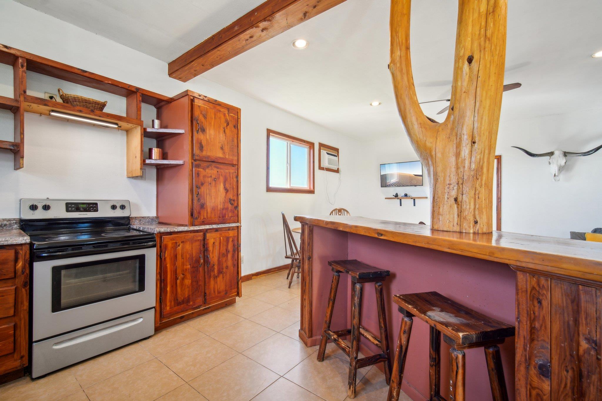 - Breakfast Bar, Built-in Features, Ceiling Fan(s), Laminate Counters, Kitchen Island, Natural Woodwork, Primary Bedroom on Main