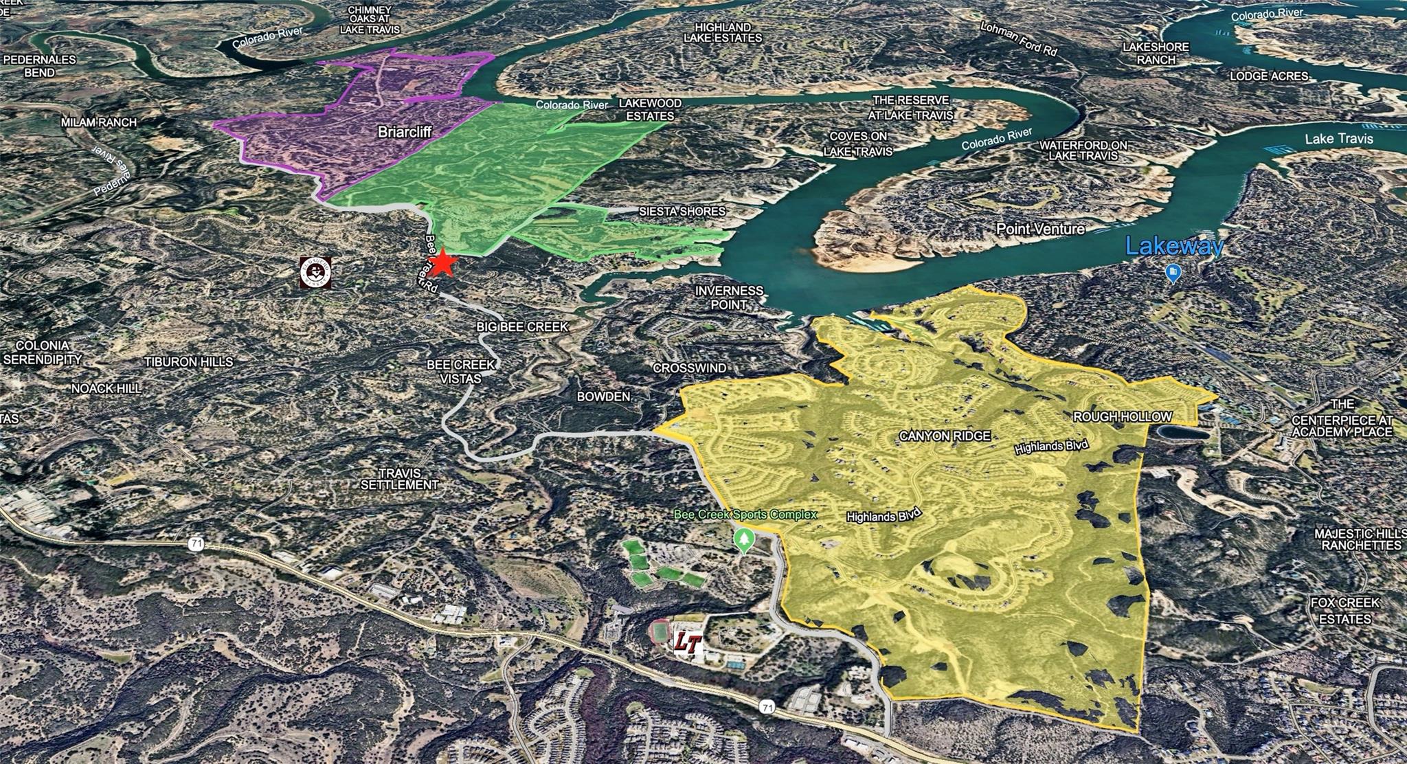 Completely Unrestricted HARD CORNER location in an Unincorporated area of Travis County, and directly across the street from the entrance to the new super upscale Travis Club Austin….a 274 Homesite/223 Villa, 1,500-acre Master-Planned Luxury Community & Golf Course!! On Bee Creek Rd., just down from Rough Hollow Elementary, Lake Travis Middle School, and only 4.5 Miles from Hwy 71, this location is ideal for a C-store, small r...
