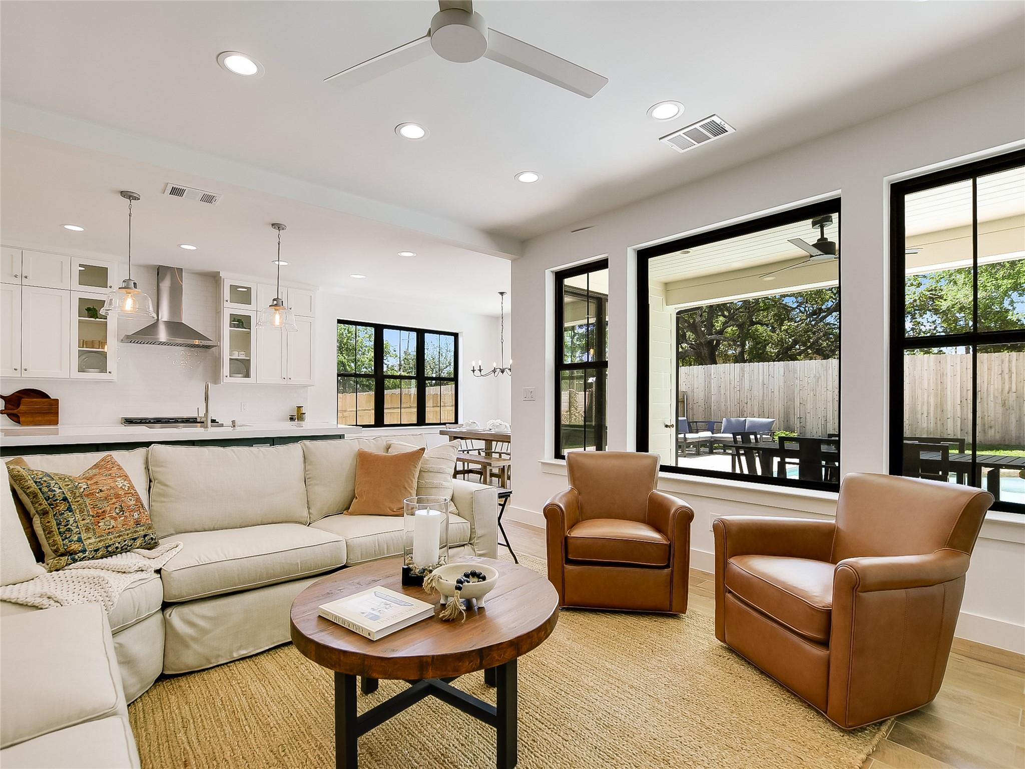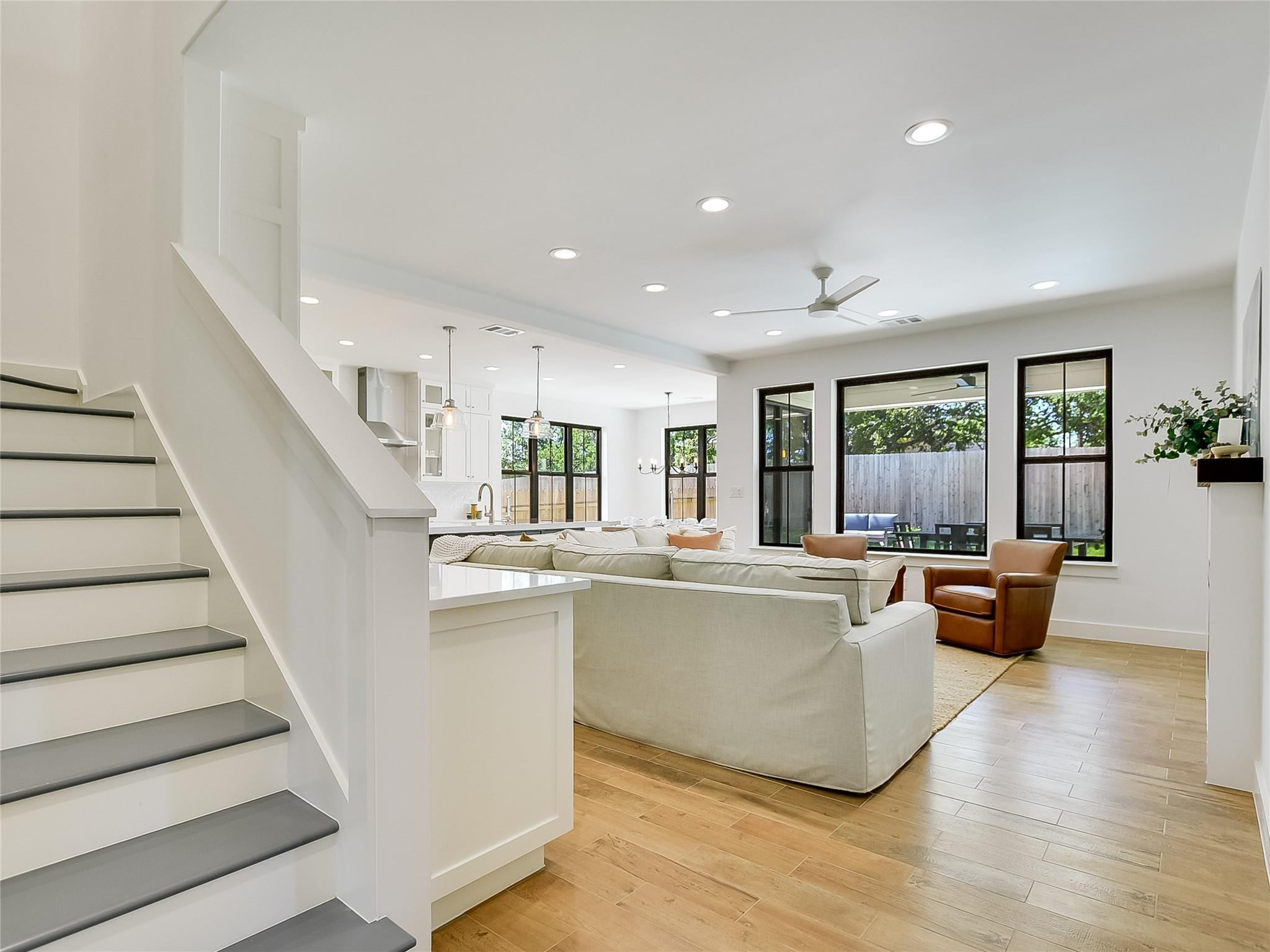 - Breakfast Bar, Built-in Features, Ceiling Fan(s), Ceiling-High, Quartz Counters, Dry Bar, Eat-in Kitchen, Entrance Foyer, Interior Steps, Kitchen Island, Multiple Living Areas, Open Floorplan, +4 more