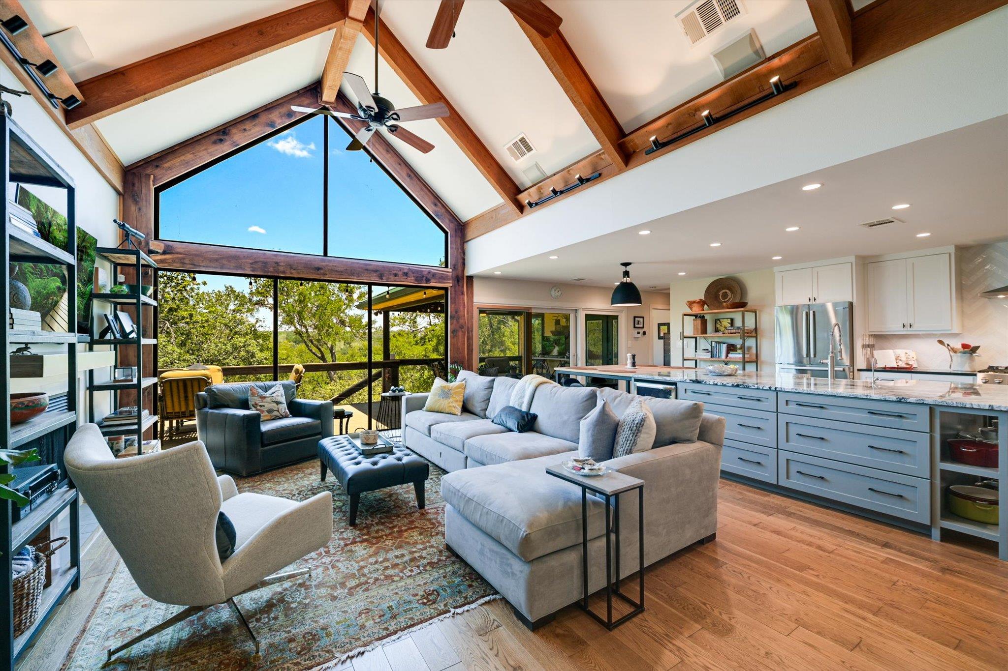 You will love this luxury living on 3ac. fronting the Pedernales spur of Lake Travis! This beautiful home is perched on a bluff overlooking the lake w/ about 200' of waterfront and an easy pathway down to the water. The owners have spent over $300k remodeling the property with great attention to detail throughout and includes a redesign of the kitchen, master bed and bath as well as adding a detached garage with upstairs worko...