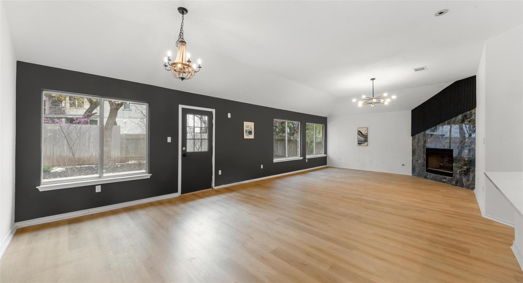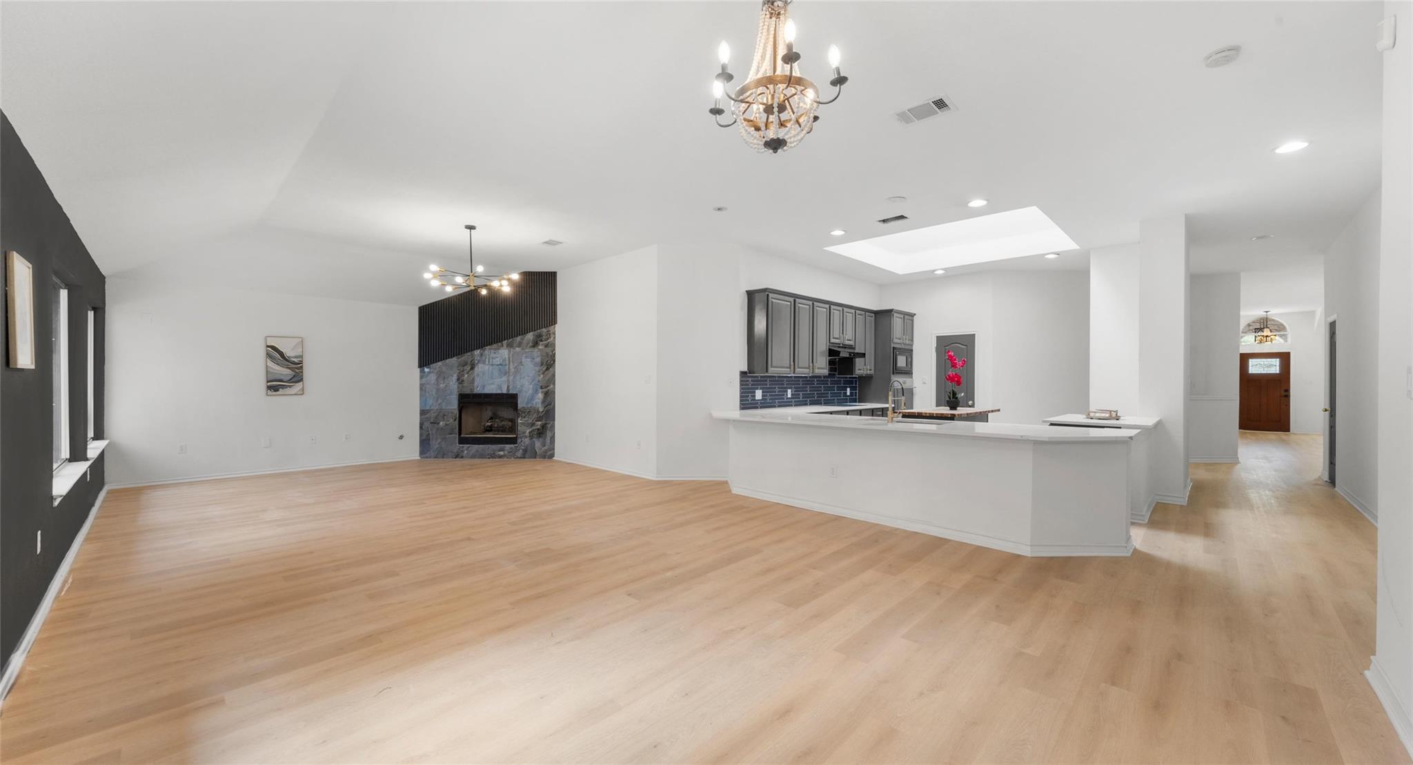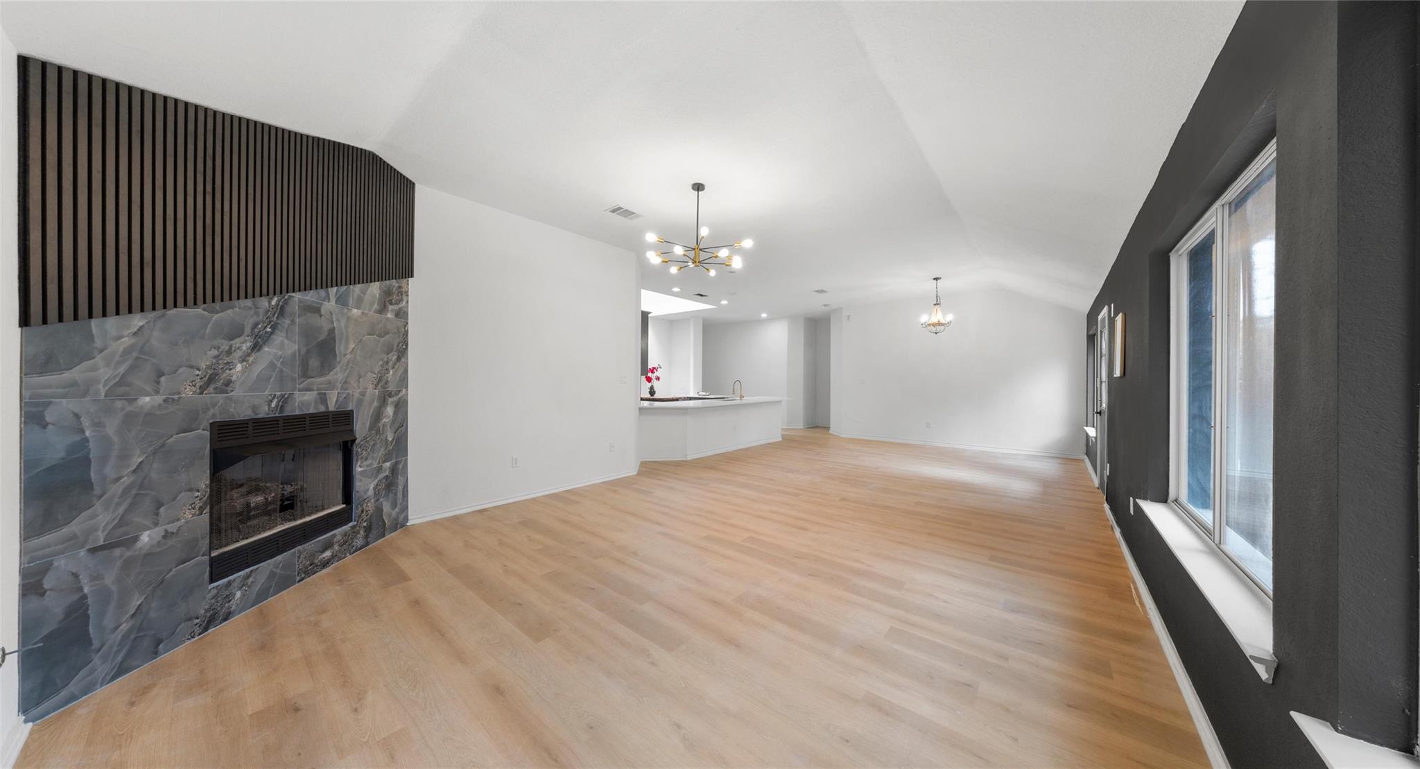 Beautifully updated single-story home in the highly desirable Forest Creek community. This spacious residence features an open floor plan with vaulted ceilings, wide plank flooring throughout the main living areas, and abundant natural light. The expansive living room centers around a dramatic floor-to-ceiling fireplace finished in designer porcelain tile and flows seamlessly into the renovated kitchen. The kitchen offers qua...