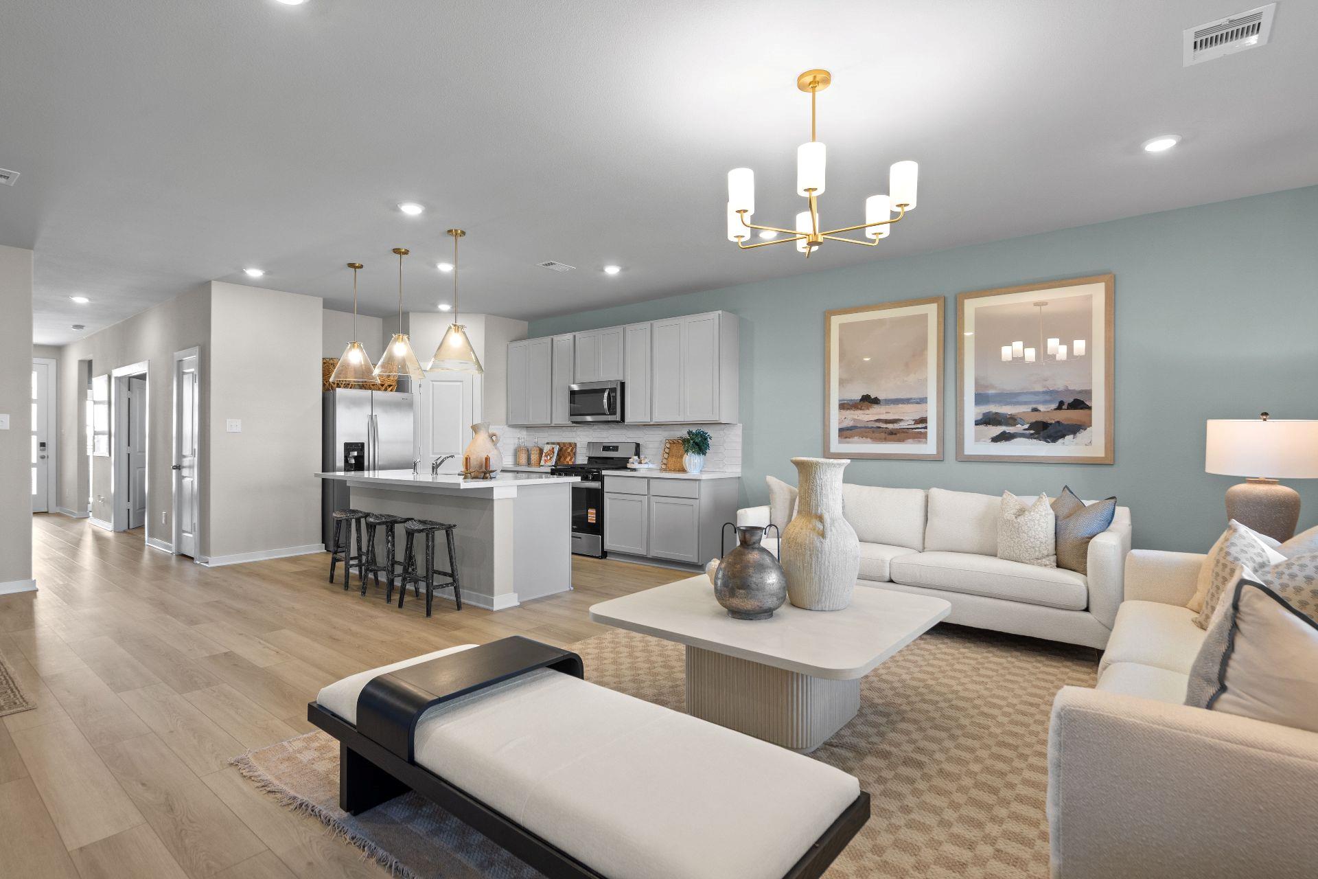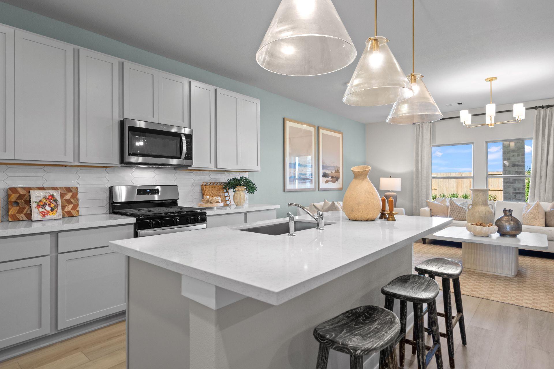 - Breakfast Bar, Quartz Counters, Eat-in Kitchen, Entrance Foyer, Kitchen Island, No Interior Steps, Open Floorplan, Primary Bedroom on Main, Recessed Lighting, Walk-In Closet(s)