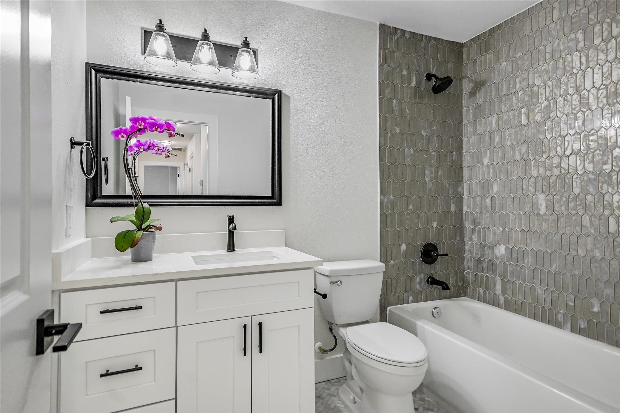 Walk through the front door and notice the remodel. The kitchen has lots of counter space and a large island, new cabinets and quartz counters. New windows offers lots of light, showing the new flooring. New light fixtures and plumbing fixtures. The property is close to the Dottie Jordan neighborhood park.