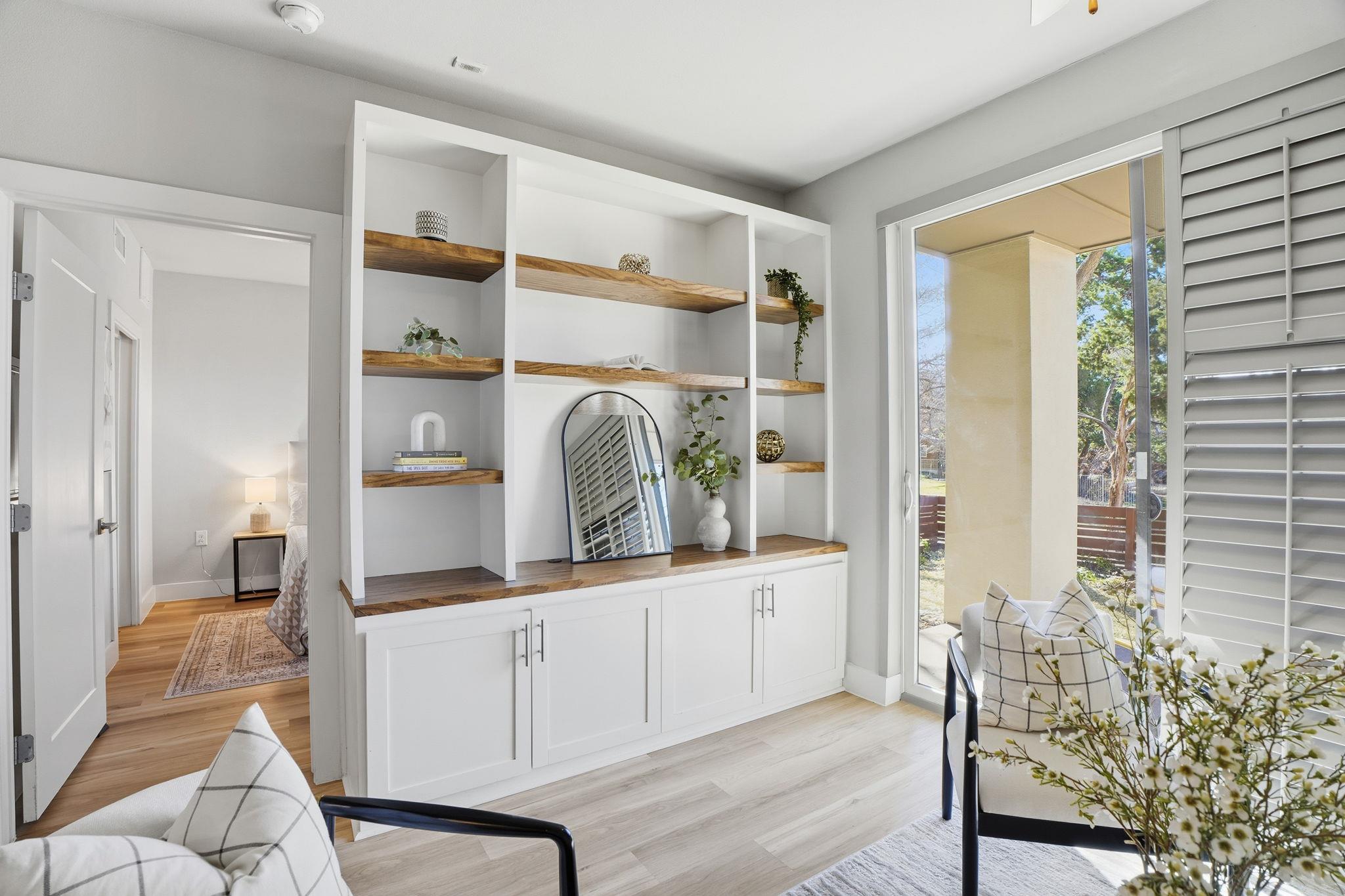 This is one of the most walkable complexes you will find. Across from South Austin Recreational Center. The community garden right outside your back yard is so peaceful. No carpet. The beautiful condo has life proof vinyl flooring throughout and tile in the bathroom. California closet and built in entertainment cabinet with storage are just some of the stand out features in this unit. Open the shutters on the sliding glass doo...