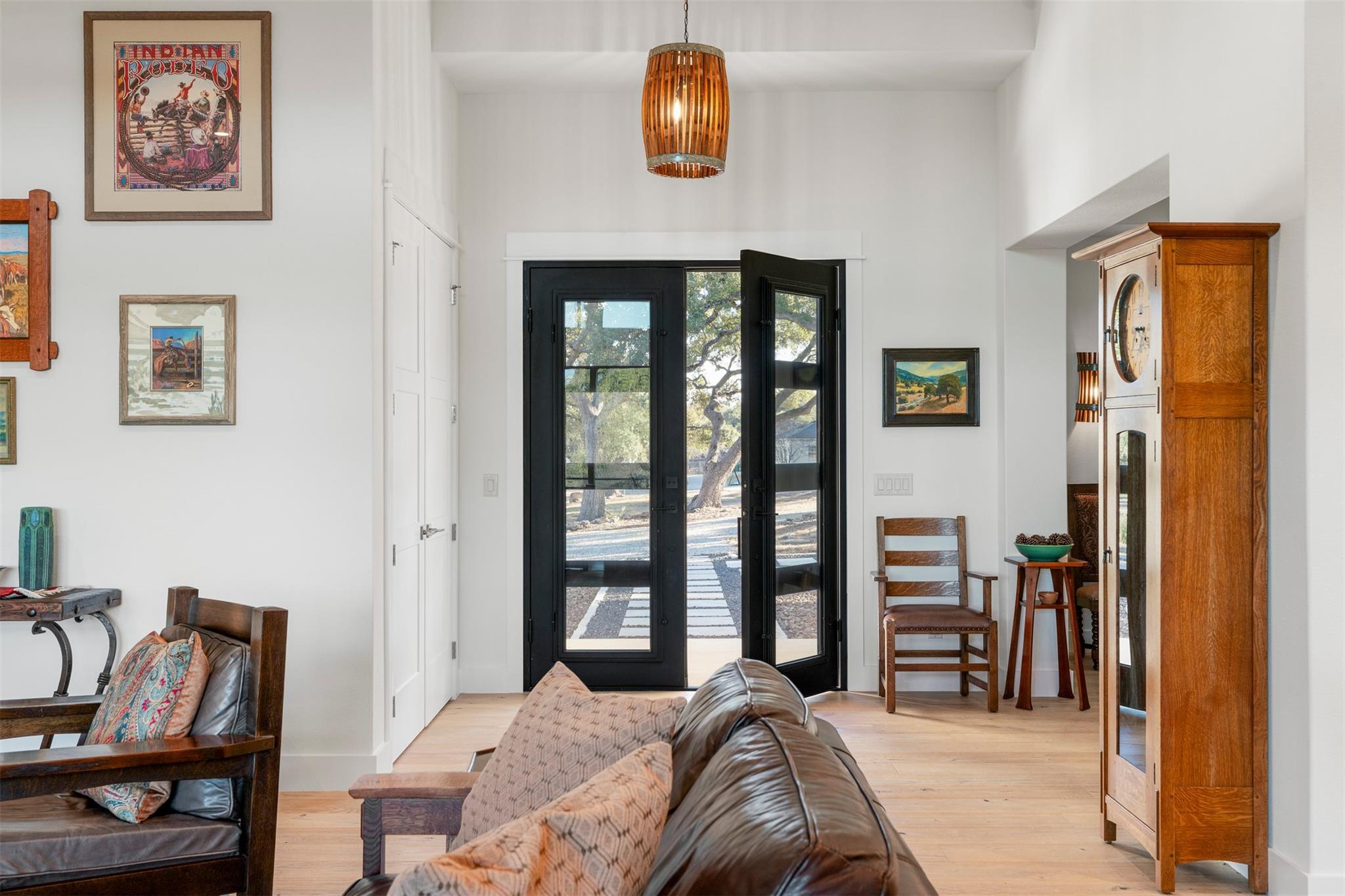 In Driftwood, this one-story Hill Country home sits on 1.5 acres with sweeping views, 4 bedrooms, and 3 full bathrooms, surrounded by mature oak trees and wide-open skies. The layout is inviting from the start. A dining area sits just off the entry on the left, complete with a built-in niche sized for a buffet or serving cabinet. The space opens into a generous living room with hardwood flooring, a wood-burning fireplace with ...
