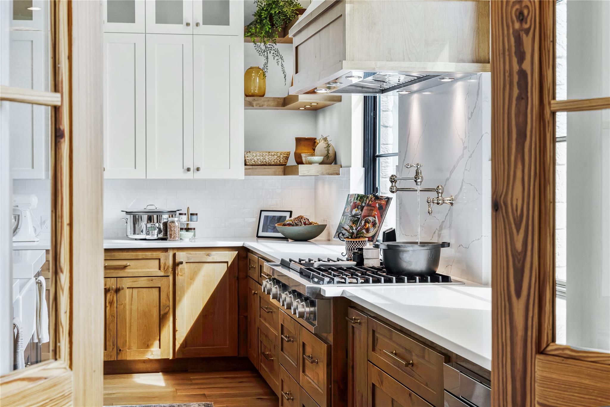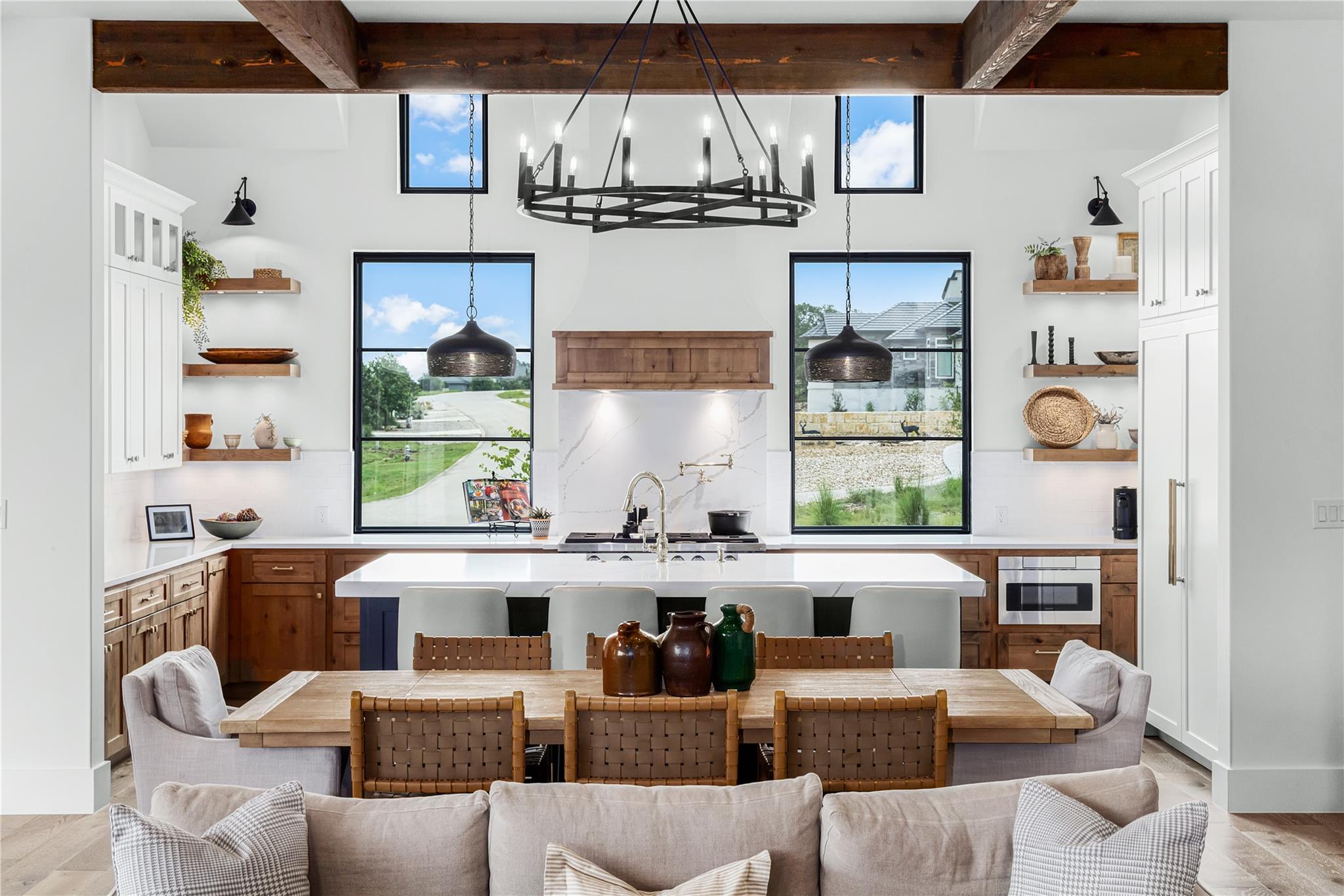 - Breakfast Bar, Ceiling Fan(s), Beamed Ceilings, Quartz Counters, Crown Molding, Double Vanity, Open Floorplan, Pantry, Primary Bedroom on Main, Recessed Lighting, Smart Home, Walk-In Closet(s), +1 more