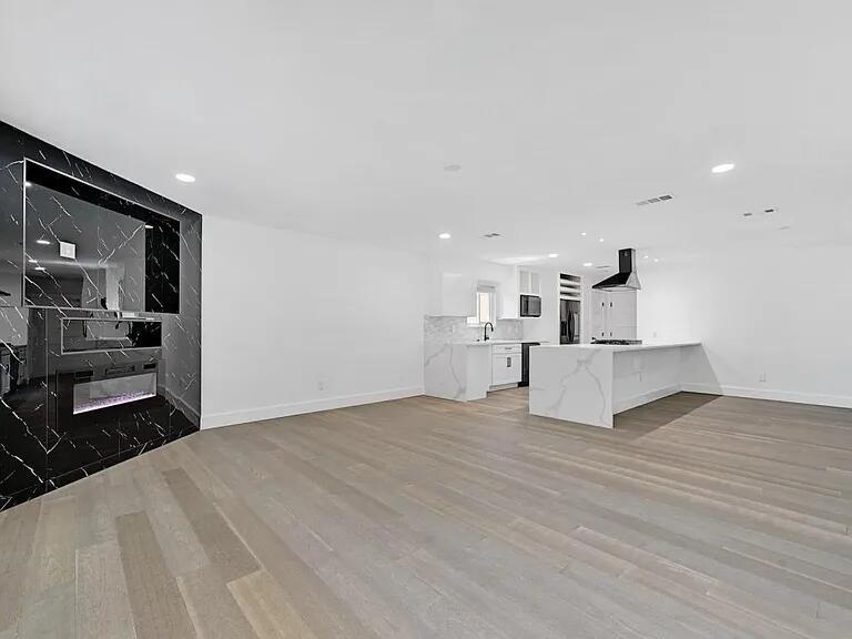 Striking modern home with an impressive front yard and a refined mix of stone, stucco, and a durable metal roof. Custom lighting and detailed exterior finishes create standout curb appeal. Inside, the open layout features upgraded finishes throughout, a sleek corner fireplace, and designer countertops. The kitchen includes updated appliances, cabinetry, and backsplash. The guest bathroom features stone accents, a soaking tub w...