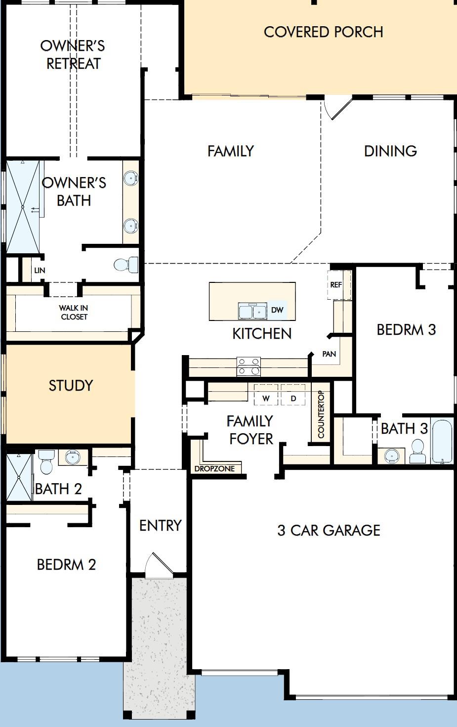 The Brackenbury by David Weekley Homes is a thoughtfully designed single-story home offering 2,421 sq. ft. that blends comfort, functionality, and timeless style. This open-concept floorplan offers three spacious bedrooms, three full bathrooms, and a dedicated study—perfect for working from home or creating a quiet retreat. At the heart of the home, expansive living and dining areas flow seamlessly together, enhanced by wa...