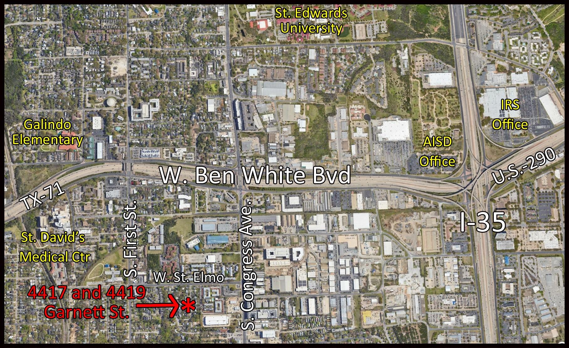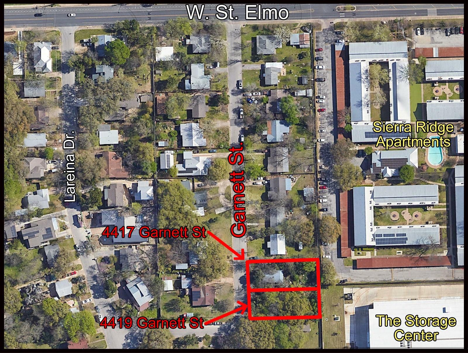 Two (2) South Austin Infill lots at 4417 and 4419 Garnett St in South Austin. Each lot is 8,427 square feet or .1935 acres in size. 4417 has a 900 square foot house on it (most likely a tear-down) and 4419 is raw land never built upon. 4419 has a large, beautiful, Oak tree at rear of lot. The lots are located in a convenient South Austin neighborhood, near Ben White (Hwy 71), Mopac (S. Loop 1), and Interstate 35. This prime...