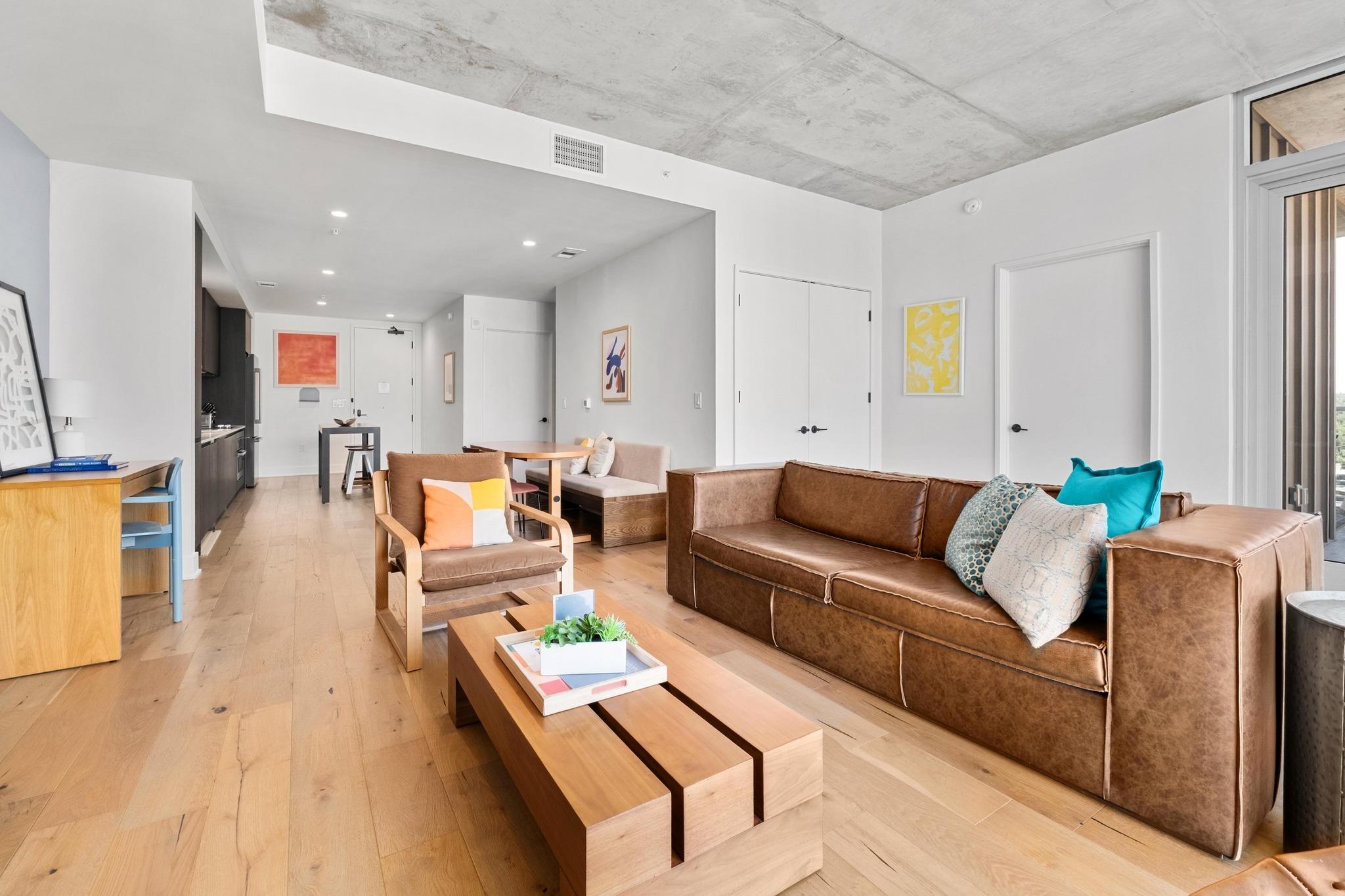 Located on the southeast corner of Natiivo Austin, Unit 1310 is a stunning two-bedroom, two-bathroom residence offering a modern and luxurious living experience. The fully furnished unit features an open-concept design with smooth-finished 10’ ceilings and floor-to-ceiling glass doors and windows, creating a bright and airy ambiance. A private terrace provides a seamless indoor-outdoor connection with expansive views. The Euro...