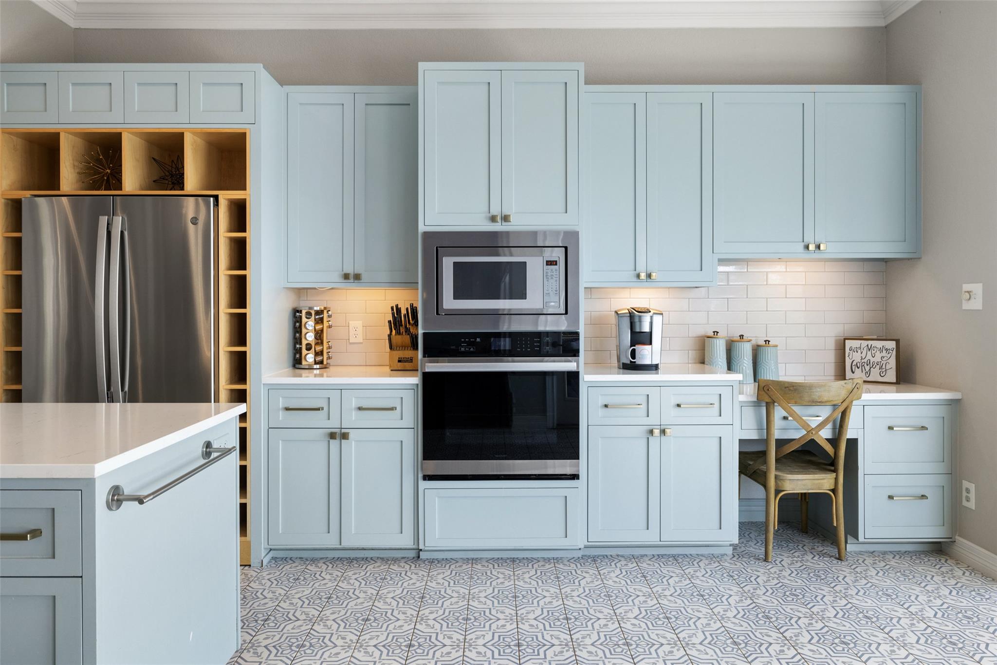 - Breakfast Bar, Ceiling Fan(s), Ceiling-High, Tray Ceiling(s), Chandelier, Quartz Counters, Crown Molding, Double Vanity, Eat-in Kitchen, Entrance Foyer, Interior Steps, Kitchen Island, +8 more