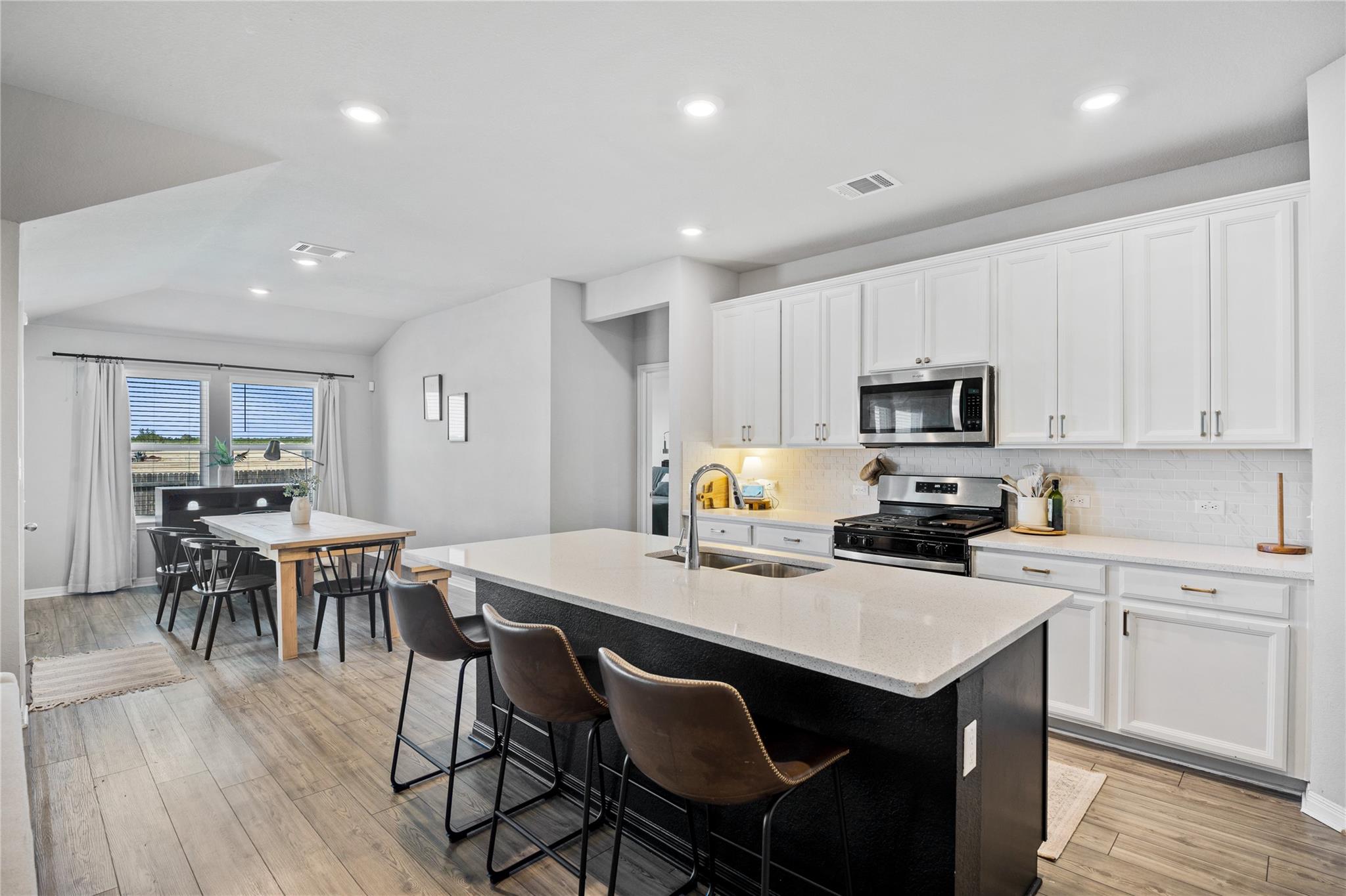 This charming home with custom upgrades when you step inside offers an open layout that connects the living, dining and kitchen spaces. The homes kitchen highlights display upgraded shaker-style cabinetry. polished quartz countertops, a walk in pantry, stainless steel gas range and an oversized island that doubles as a breakfast bar and prep space. The private primary suite at the rear of the home feels like a retreat with a...