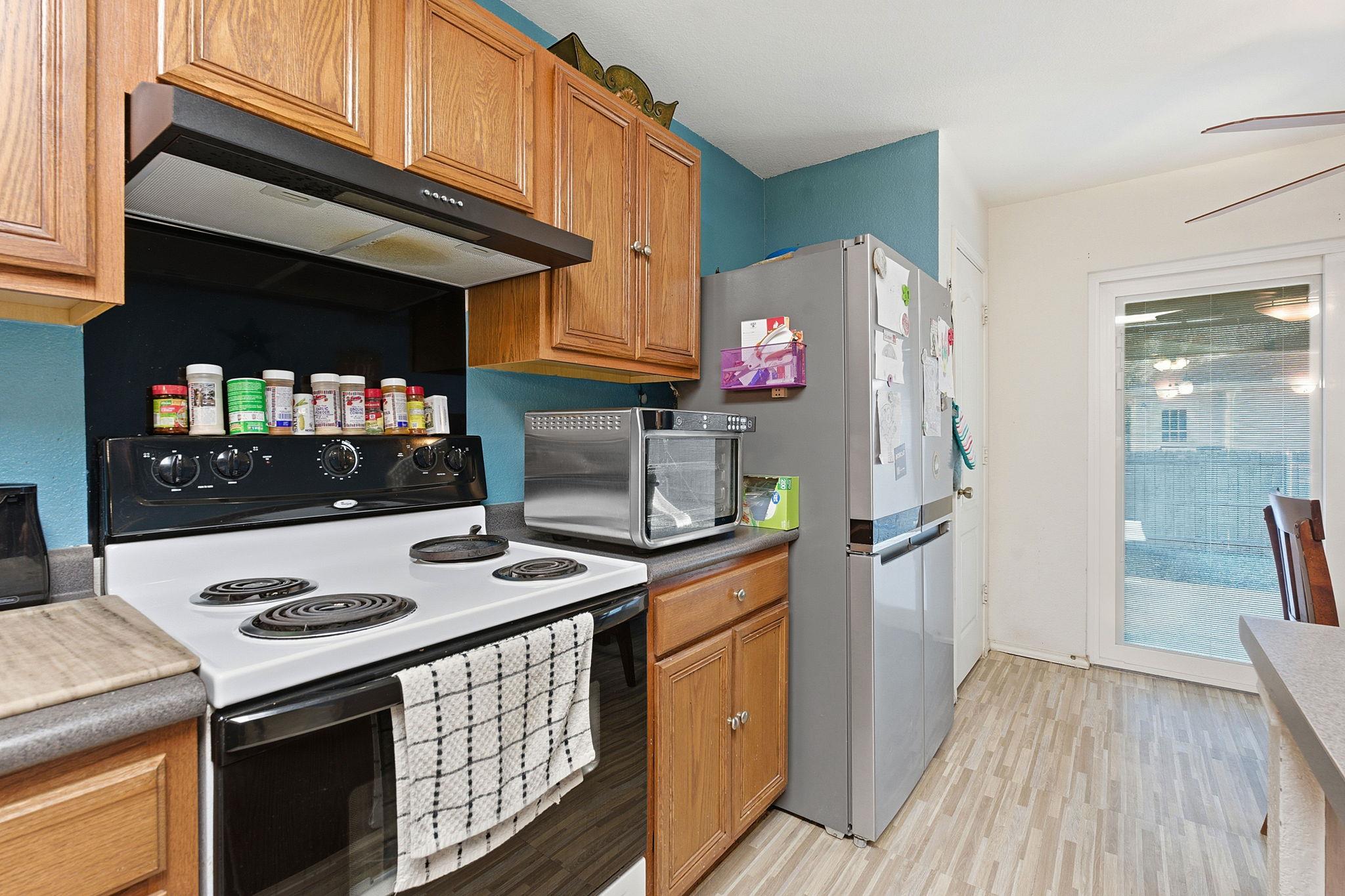 Ranch-style brick home with attached garage, driveway, and paid-off solar panels. Bright living area with ceiling fan and unfinished concrete flooring—ideal for buyers to install flooring to their own style. Kitchen features island, brown cabinetry, electric cooktop range, refrigerator, and light wood-finish flooring. Bedroom offers light carpet, ceiling fan, and private ensuite bath. Recent updates include roof (3/2023), gut...