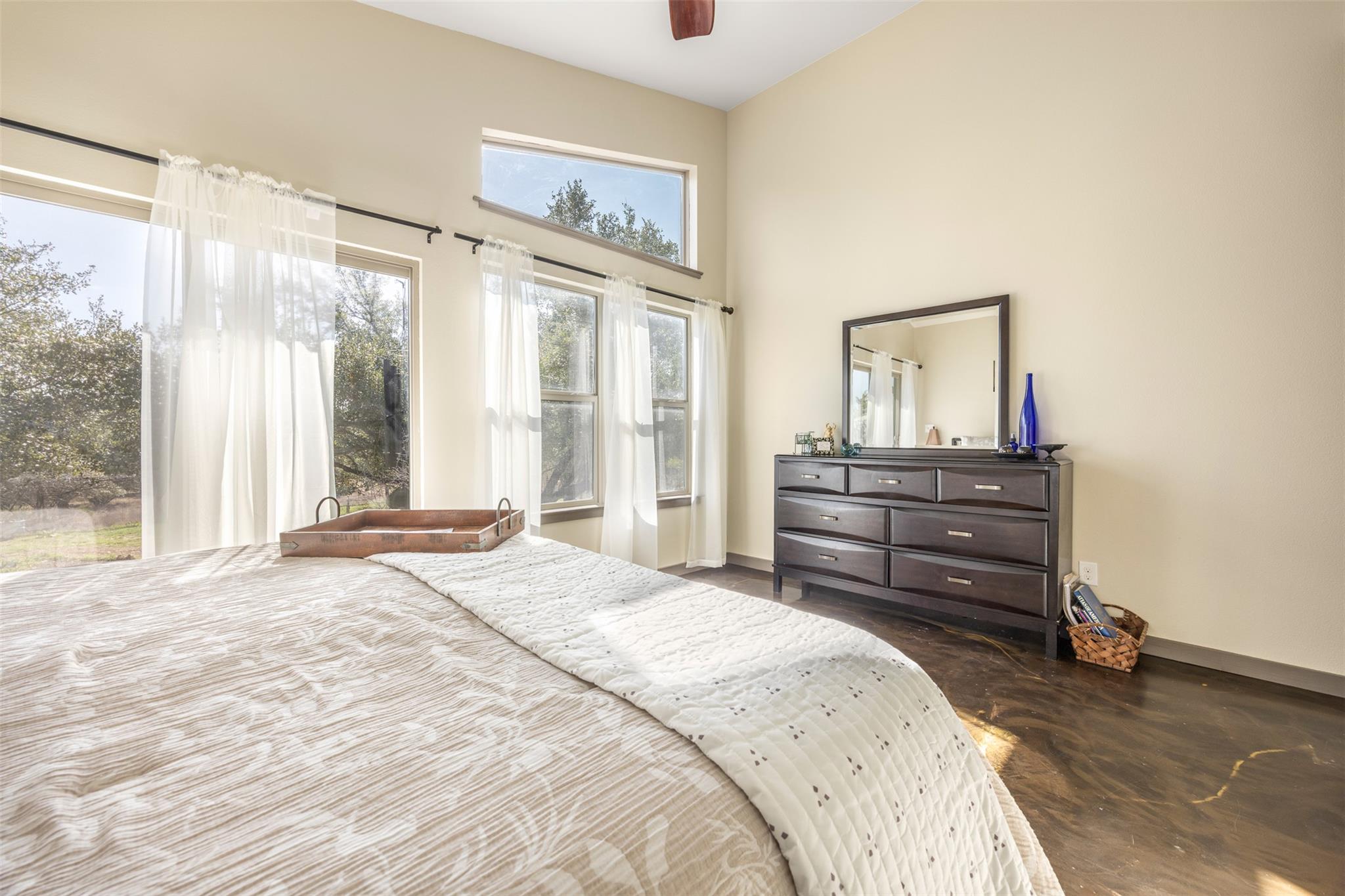 Bohemian style with a view! Custom-built by a creative couple, this Wimberley home boasts unique features including hand-crafted epoxy floors, live-edge breakfast bar and views from every room. Large flex room with built-ins is currently used as a spacious music room, but can serve as office, playroom or closed off for an additional bedroom. The property includes solar panels, full rainwater collection, outdoor shower, electr...