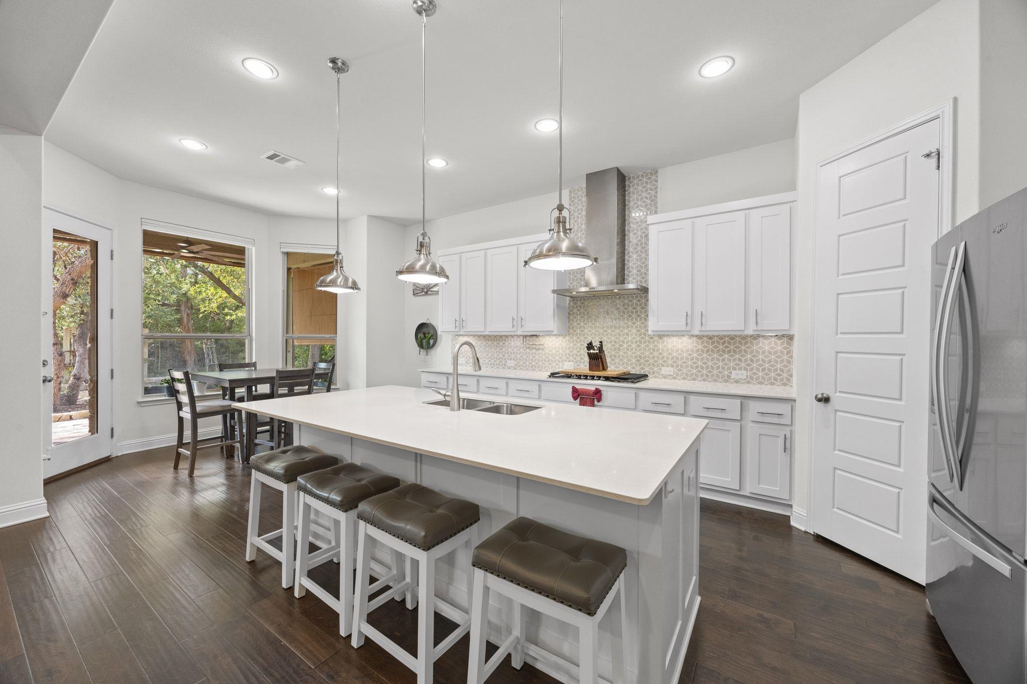 Located in the heart of Dripping Springs, this pristine and quality built 2 story home boasts plenty of upgrades and amenities! Beginning with the interior of the home, the open layout with engineered hardwood throughout the first floor and soaring high ceilings make this home feel massive, yet warm. The kitchen is equipped with stainless steel appliances, white quartz style countertops, gorgeous white cabinetry with plenty of...