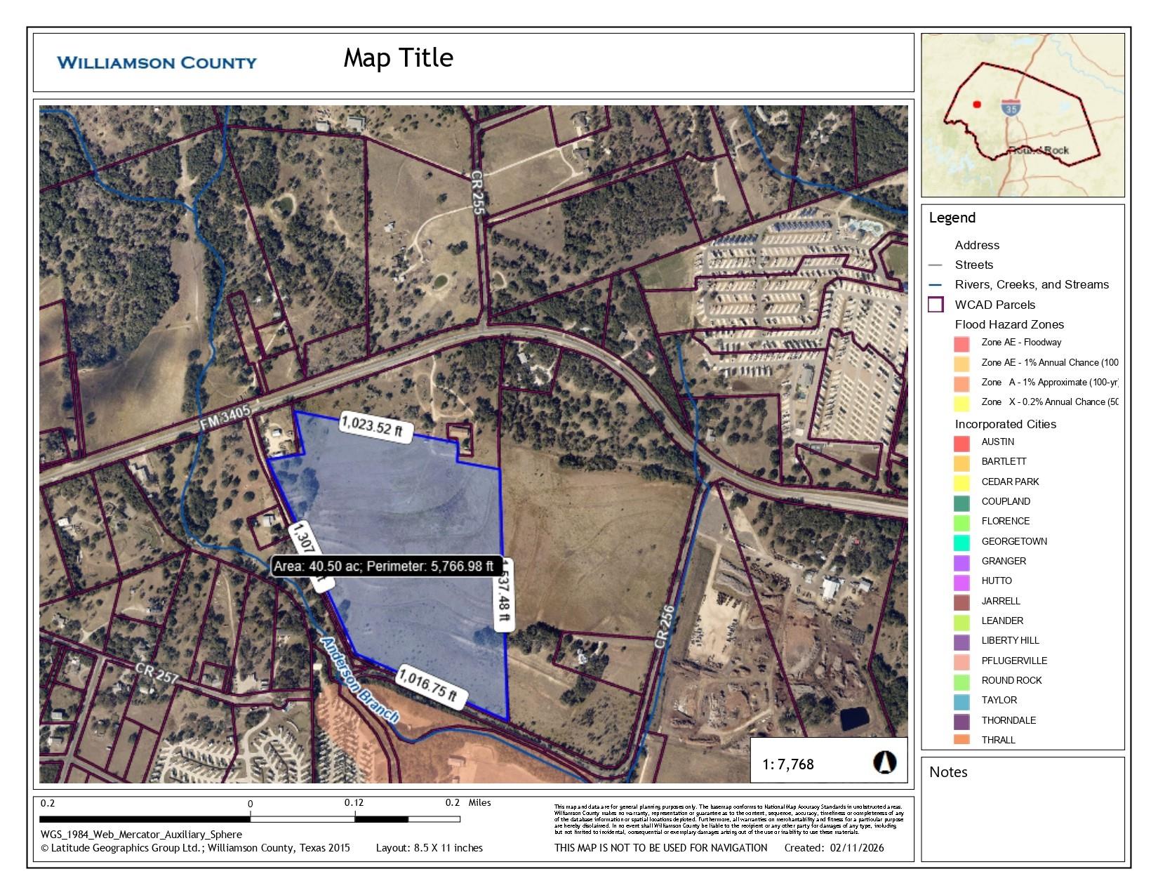Ready for Development. 40 acres unrestricted with 12in waterline along FM 3405. Lots of possibilities: 1acre subdivision, data center, office/warehouse or relocate your business. The 40 acres has frontage on County Road 257 & FM 3405. The property sits between US Hwy 183 & Ronald Reagan Blvd. The county just purchased 9 acres for ROW. The future plan is to straighten Fm 3405. The 40 acres will front the new FM 3405 alignment....