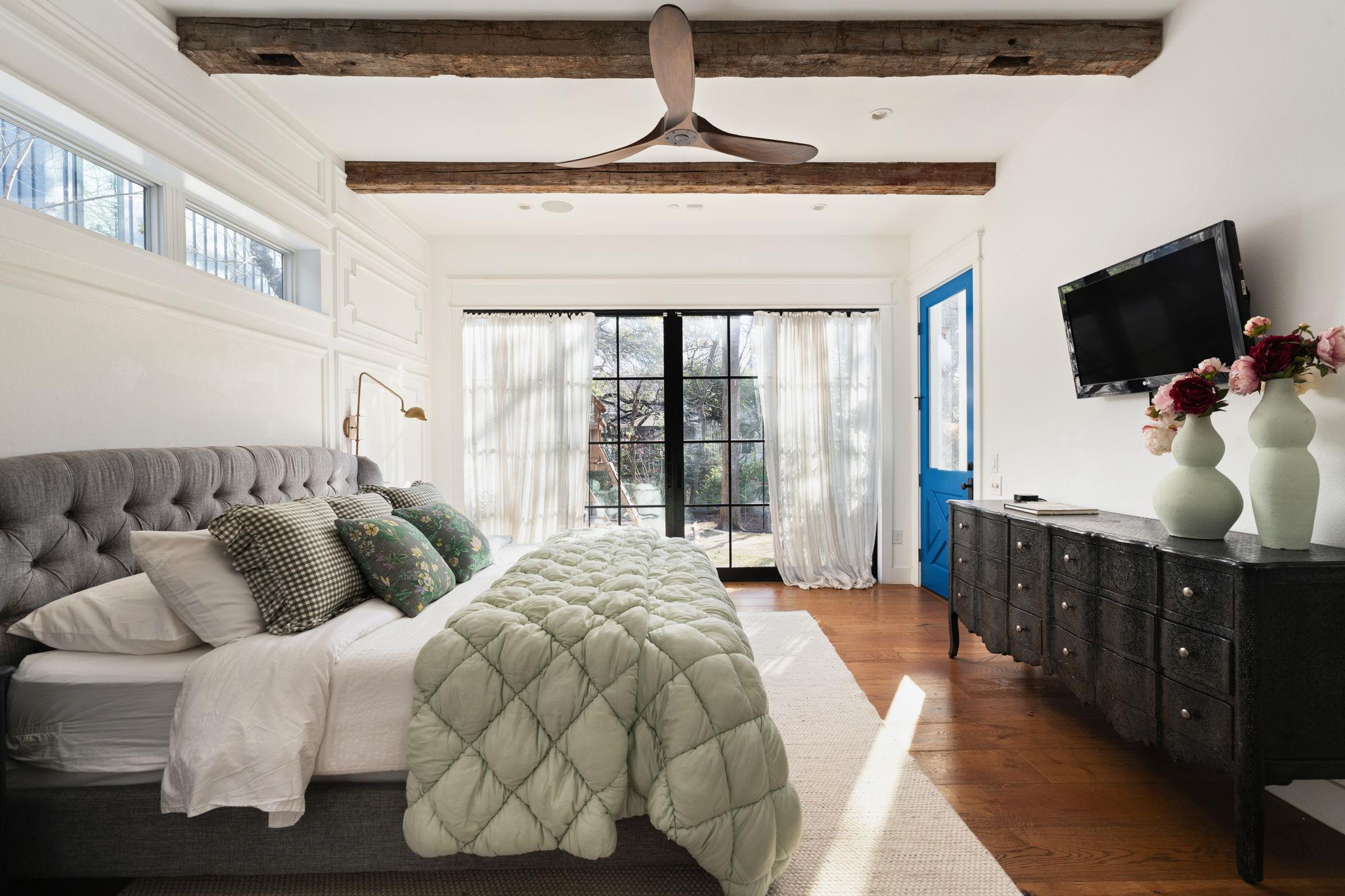 Tucked in the heart of Travis Heights just steps from South Congress, this modern farmhouse feels like a private retreat layered with color, texture, and thoughtful design. A white exterior with blue doors, metal rooflines, and warm wood accents sits behind a gated yard surrounded by lush landscaping, an expansive lawn, flourishing gardens, and a serene creek bed that creates a true urban oasis. Inside, reclaimed Austin shipl...