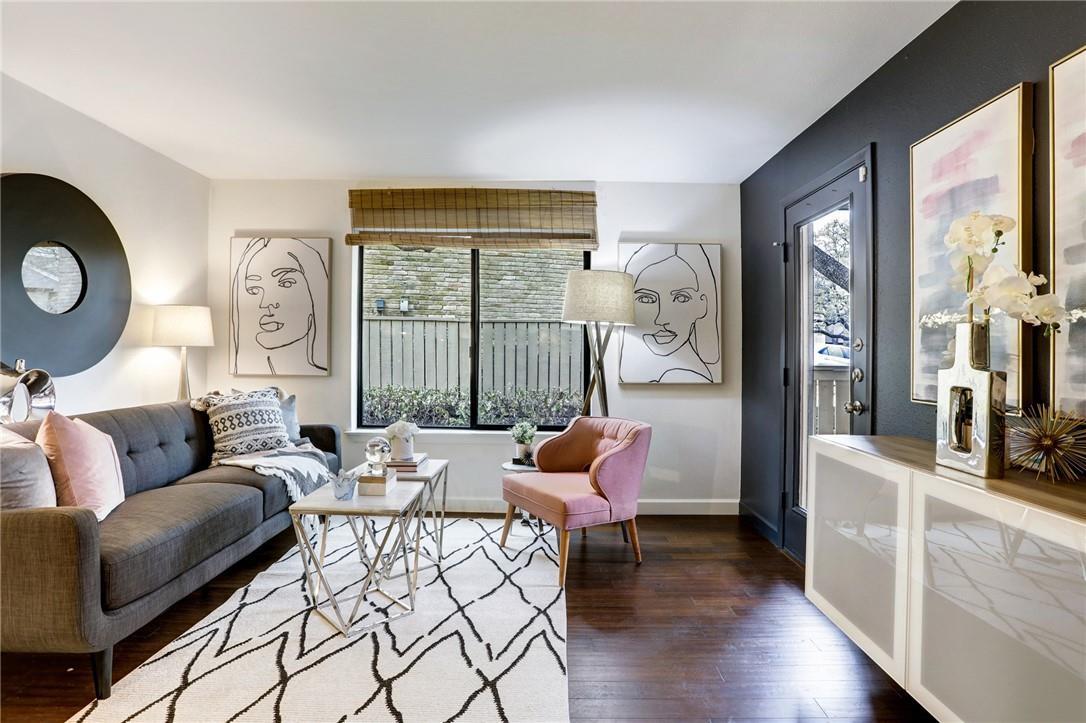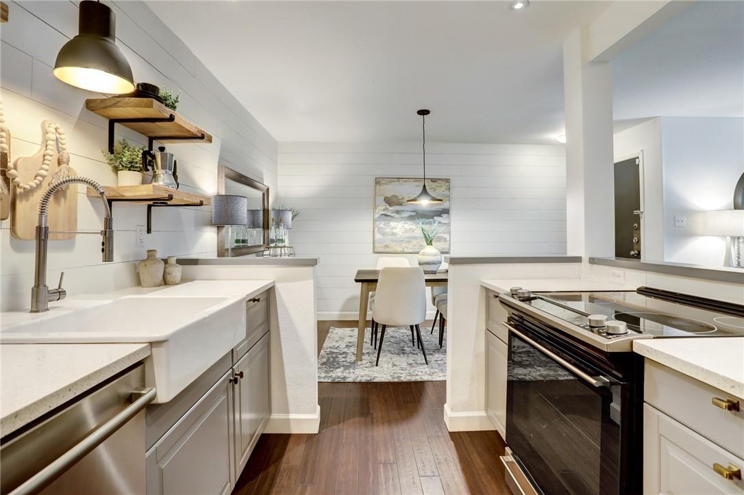 Tucked beneath mature oak trees in the Arbors community, this Northwest Hills condo offers a peaceful retreat with a fresh, modern feel. Recent updates include new interior paint and brand-new carpet throughout. The open-concept layout features hardwood floors and custom built-in cabinetry in both the dining and living spaces, adding character and functionality. The kitchen shines with rustic open shelving, a farmhouse sink, a...