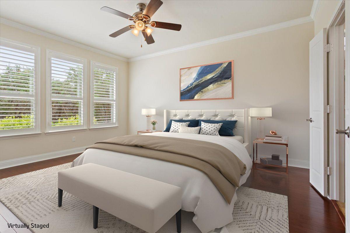 Perfectly positioned on a quiet cul-de-sac with greenbelt views on two sides, this thoughtfully designed Surrey Crest home offers a relaxed and refined take on Sun City living. Featuring 2 bedrooms, 2 baths, and a versatile flex space, the open layout is designed for both comfort and effortless living. Wood flooring flows throughout the main areas with no carpet, complemented by 5-inch baseboards, crown molding, and plantation...