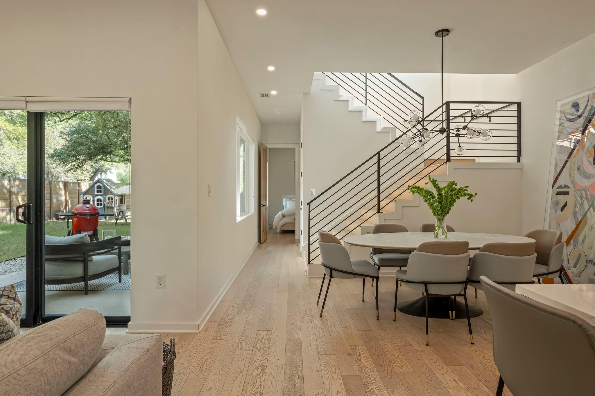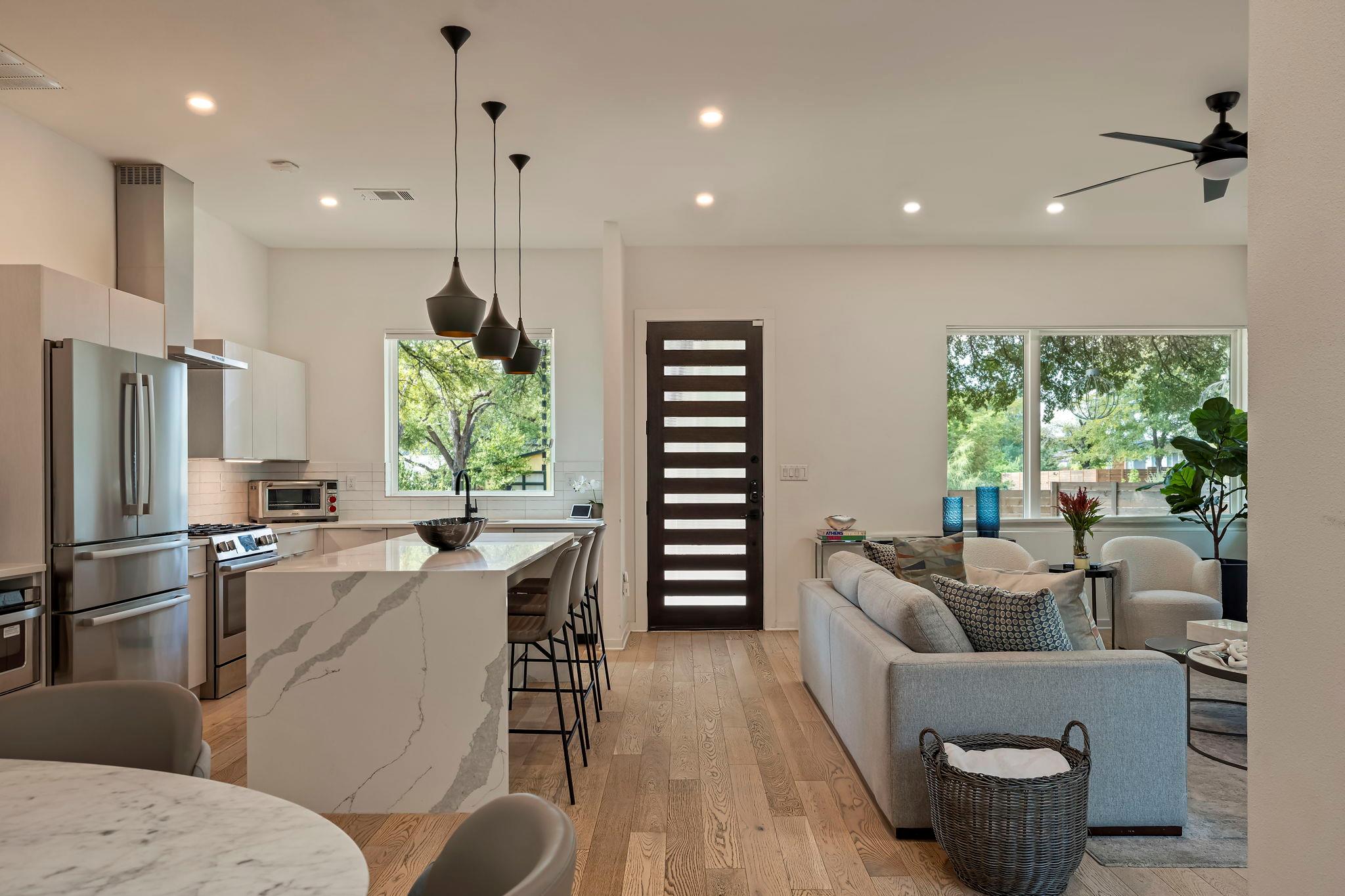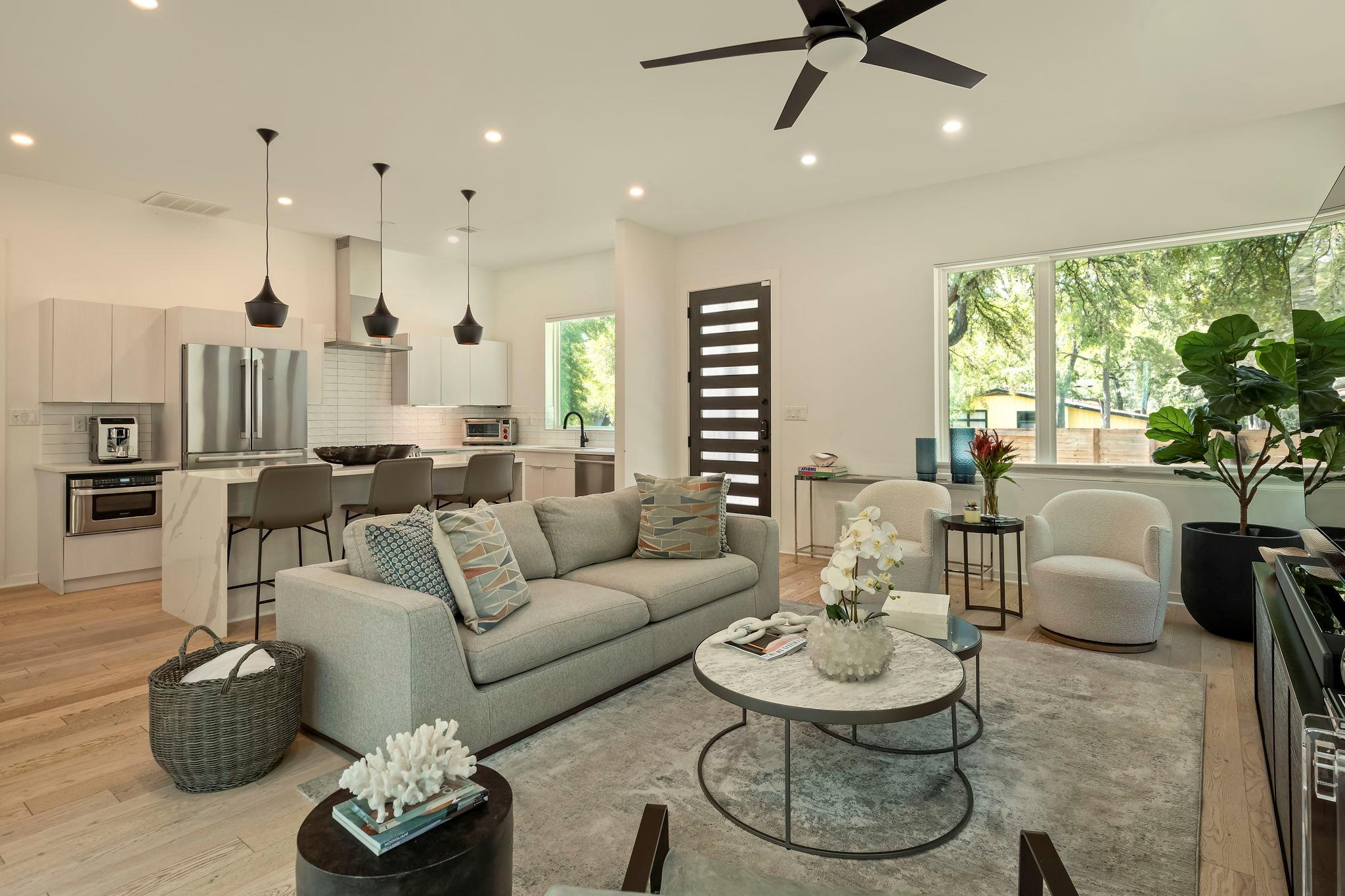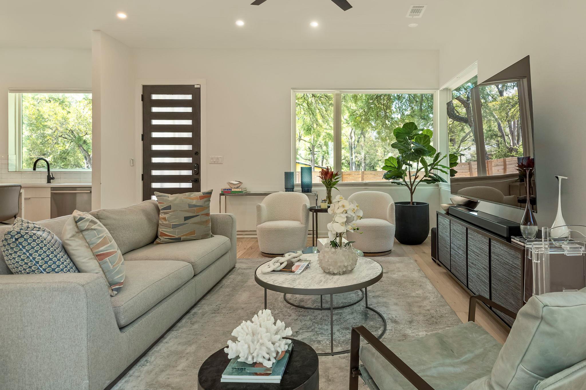 Located in the St. Elmo District / South Manchaca neighborhood along a quiet tree-lined street, this corner property lives like a single-family home. Completely fenced and gated, it offers privacy with both a front yard and a backyard shaded by mature Live Oak and Elm trees. This thoughtfully designed 3-bedroom, 3-bathroom home also includes a detached bonus studio for use as an additional room, gym, office, or creative space....